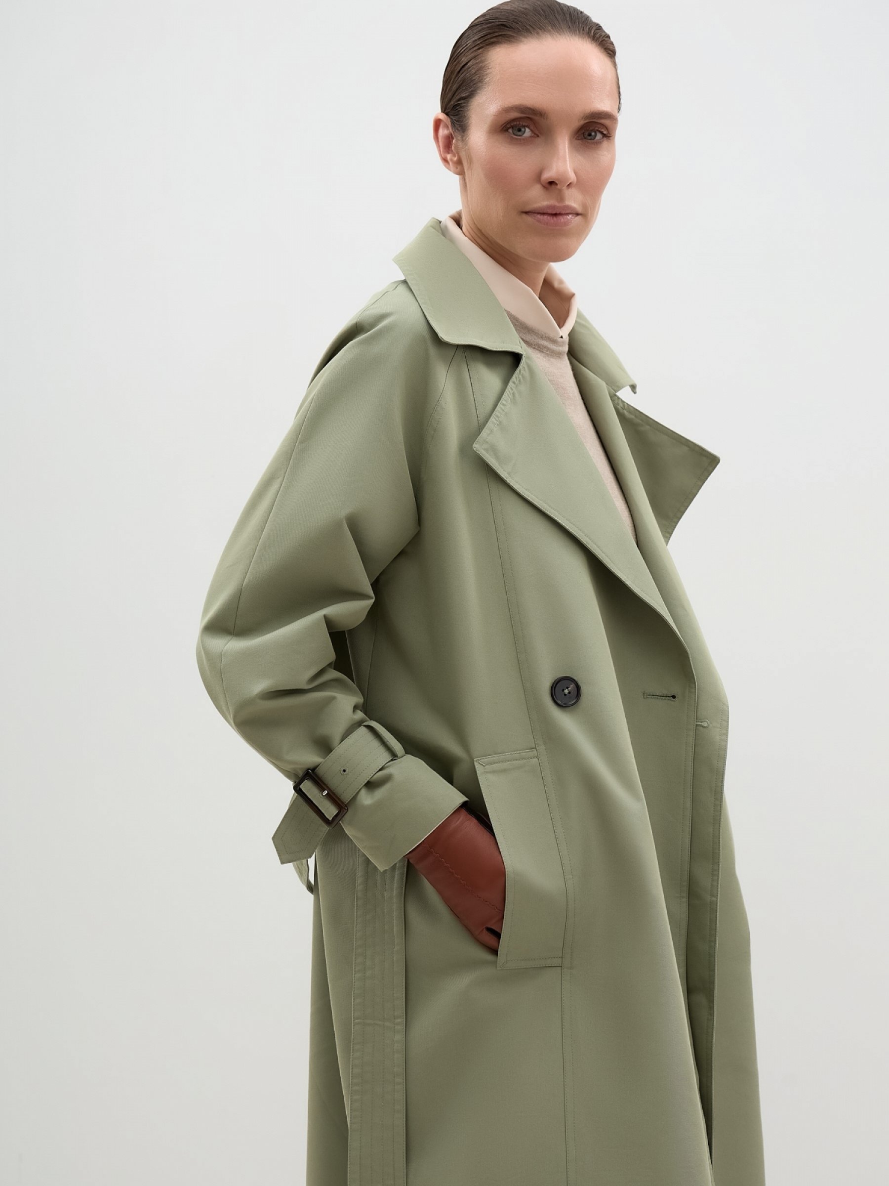 Классический двубортный тренч – базовый вариант для теплого демисезона и лета. Сконструирован для красивой посадки на любую фигуру: с высокой встречной складкой на задней кокетке, рукавами реглан и в правильной длине миди. Пояс и паты на рукавах с контрастными пряжками локально регулируют объемы, а вкупе с английским воротником статусно усложняют визуал изделия. Плотная хлопковая ткань согревает и позволяет телу дышать. Шелковистая подкладка в тон. верх: 65% хлопок, 35% полиэстер; подклад: 100% полиэстер