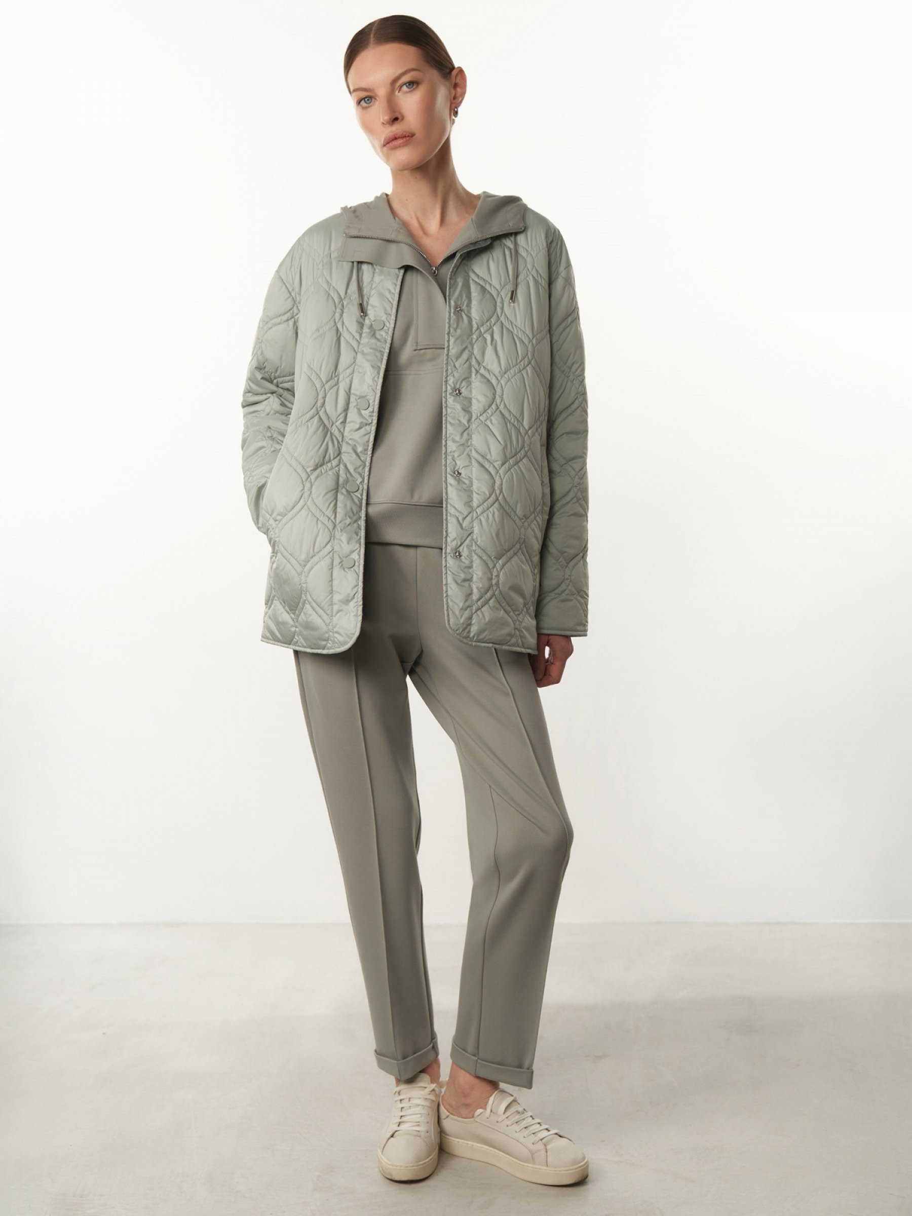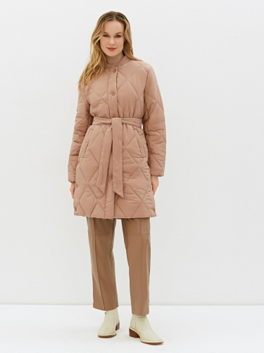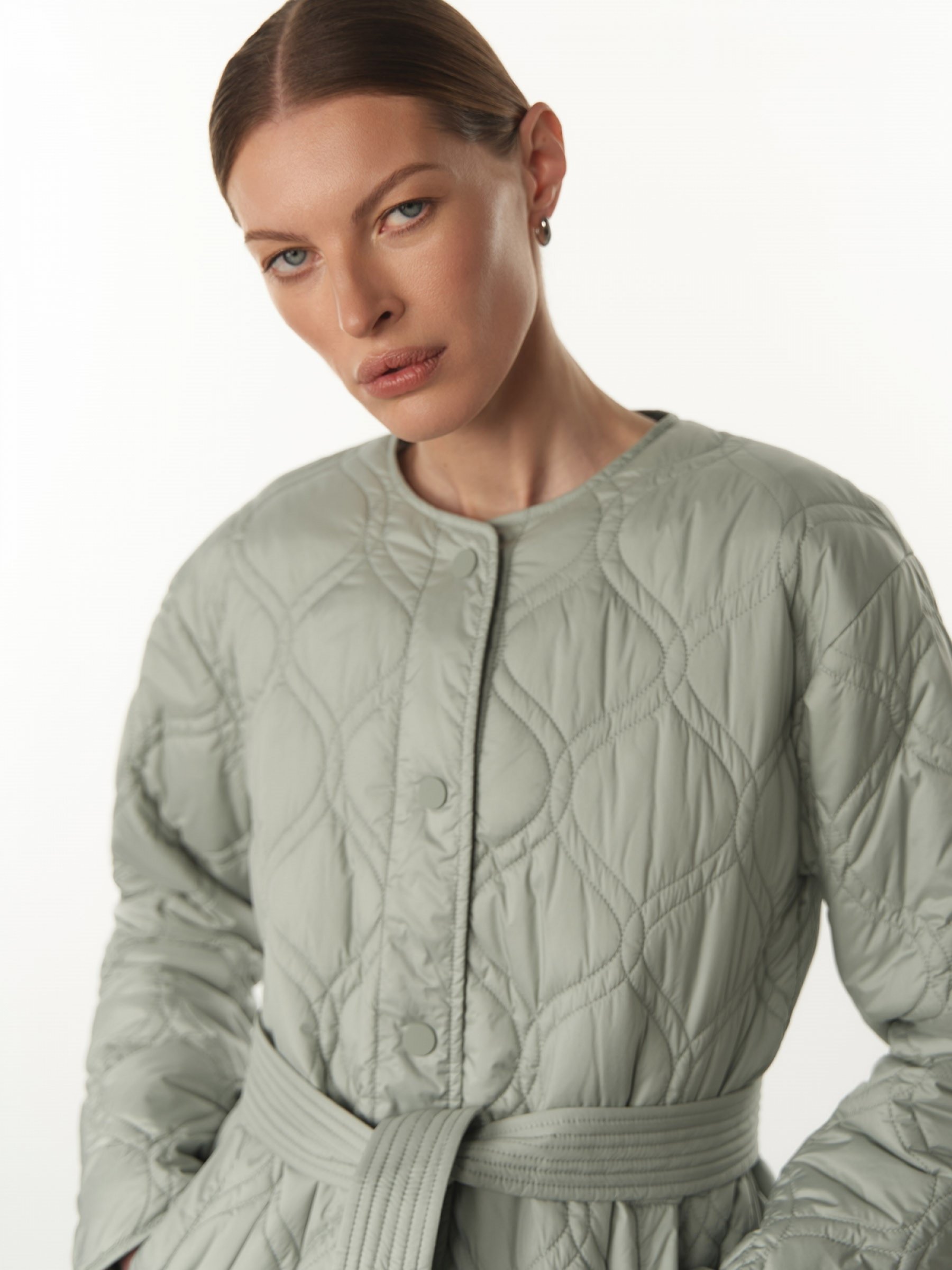Стильная куртка-жакет прямого силуэта классической длины – лаконичная и универсальная. Идеальна для городских casual-образов. Выполнена из легкой прочной ткани, утеплитель – синтепон. Двойная волнообразная вертикальная стежка зрительно вытягивает силуэт и украшает изделие. Застегивается на матовые прорезиненные пластиковые кнопки в тон. Удобные прорезные боковые карманы на кнопках. Куртка дополнена тканевым поясом на шлевках. Три красивых актуальных цвета: черный, ментол и ваниль. верх: 100% полиэстер; подклад: 100% полиэстер; наполнитель: 100% полиэстер