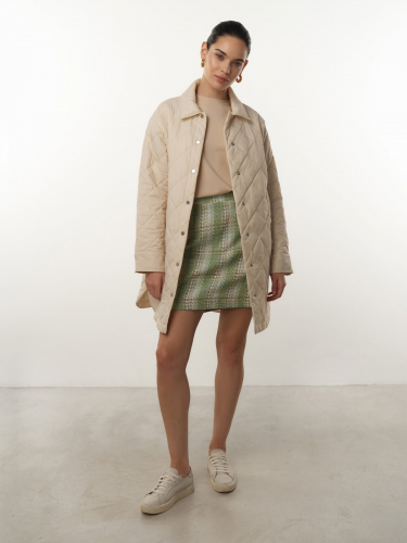 Женственная стеганая куртка прямого силуэта. Модель с отложным английским воротником застегивается на потайные кнопки. Нестеганые детали – центральный элемент и карманы – делают классический образ фактурнее и интереснее. Тканевый пояс с пряжкой в тон подчеркивает силуэт. Квадратные накладные карманы вместительные и удобные. Куртка изготовлена из прочной, легкой, приятной на ощупь ткани, утеплена синтепоном, гарантирующем комфорт, легкость и простоту в уходе. Три освежающих варианта цвета: бежевый, молочный и светло-голубой. верх: 100% полиэстер; подклад: 100% полиэстер; наполнитель: 100% полиэстер