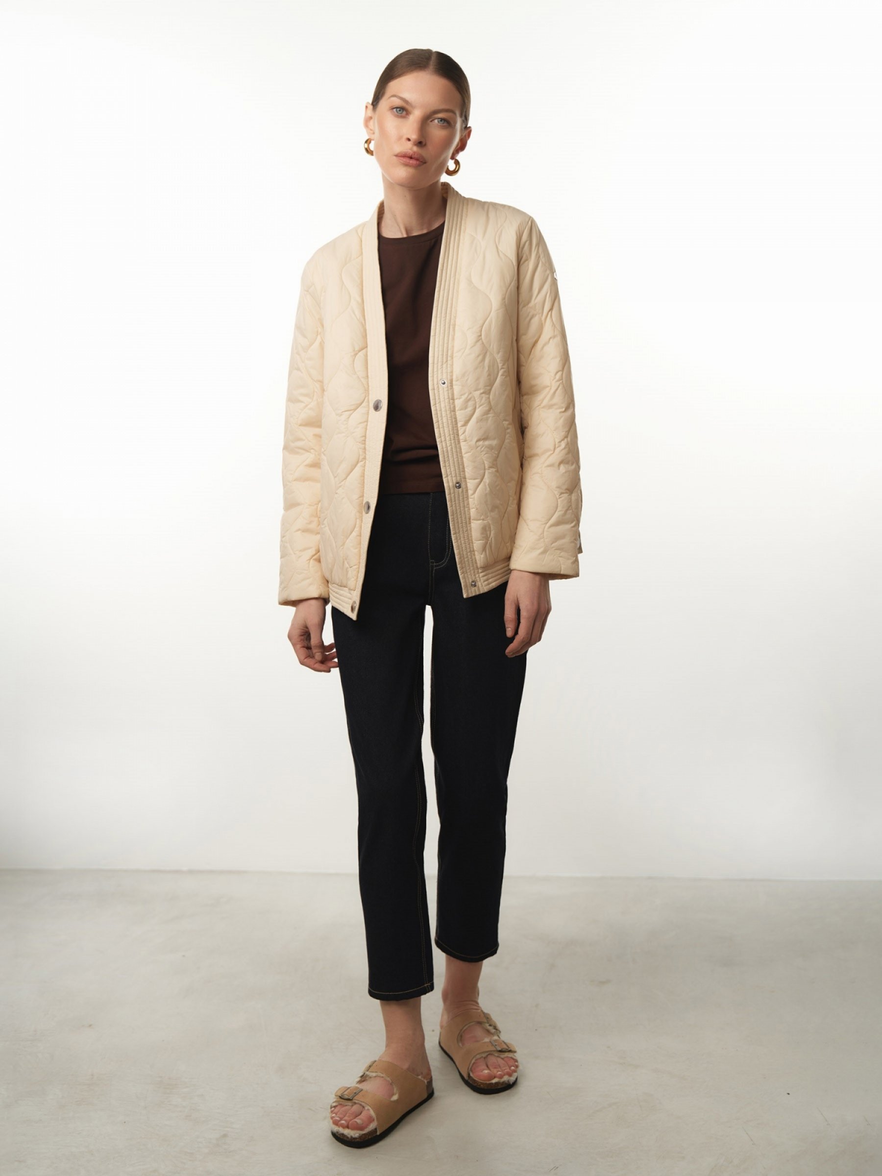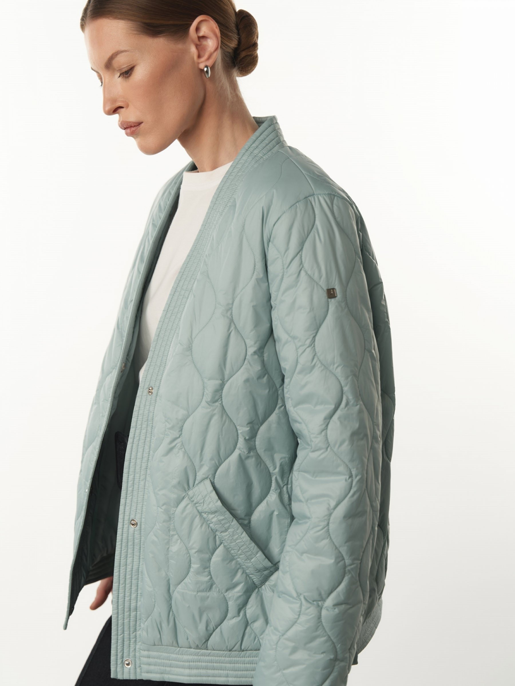 Стильная утепленная куртка в стиле casual для любительниц лаконичных образов. Выполнена из прочной, легкой, приятной на ощупь ткани, утеплена синтепоном, гарантирующим комфорт, легкость и простоту в уходе. Волнообразная стежка визуально вытягивает силуэт и украшает изделие. Боковые прорезные карманы с листочкой вместительные и удобные. Куртка застегивается на металлические кнопки. По низу изделия – декоративные застежки на кнопках. Три холодных универсальных цвета: сливочный, голубой и тиффани. верх: 100% нейлон; подклад: 100% полиэстер; наполнитель: 100% полиэстер