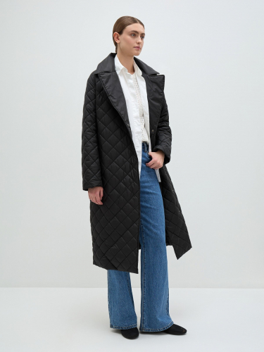 Минималистичное двубортное пальто миди идеально для прохладной весны и осени. Выполнено в классической эстетике – прямой силуэт, отложной английский воротник на пуговице, чуть приспущенное плечо, тканевый пояс. Для тепла и защиты от ветра модель реализована в непродуваемой матовой ткани, утеплена среднеплотным высокотехнологичным синтепоном. Стежка мелкий ромб убирает лишний объем. Манжеты адаптированы под подворот. Пальто комфортно застегивается на два ряда потайных металлических кнопок. Шелковистая подкладка в тон. верх: 100% полиэстер; подклад: 100% полиэстер; наполнит: 100% полиэстер