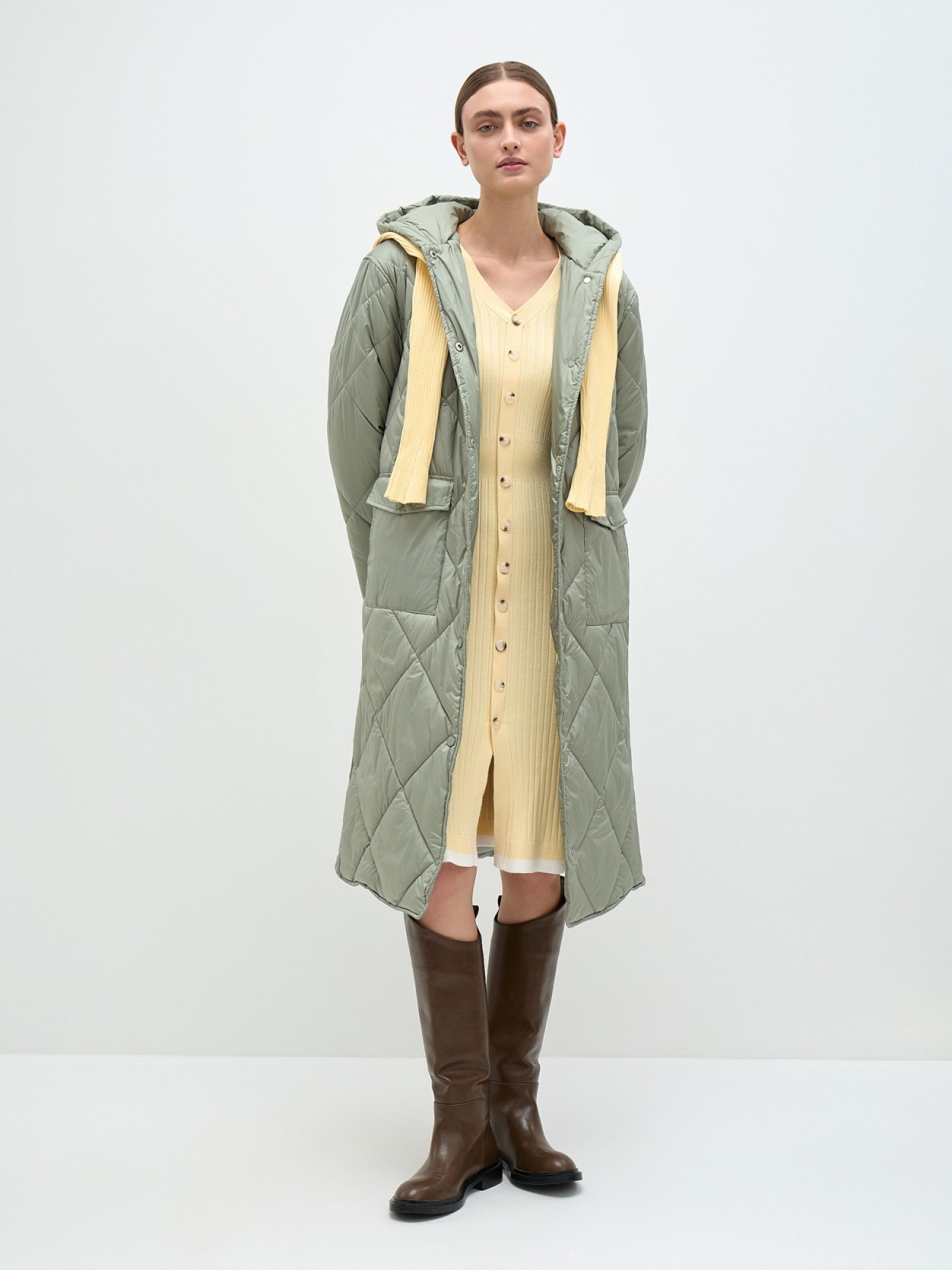 Стеганое пальто с несъемным капюшоном – практичный вариант на первую половину весны или осени. Выполнено из плотной непродуваемой ткани, которая не вбирает в себя грязь, утеплено среднеплотным синтепоном, изнанка закрыта скользящей подкладкой в тон. Градиентная стежка ромб моделирует силуэт, делая портретную зону более аккуратной. Накладные карманы с клапанами и основная застежка – на матовых металлических кнопках в тон. В комплекте тканевый пояс на шлевках. верх: 100% полиэстер; подклад: 100% полиэстер; наполнит: 100% полиэстер