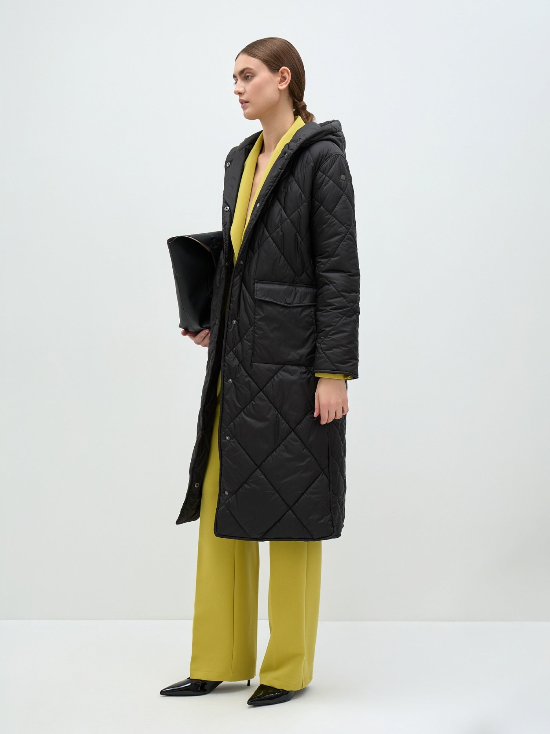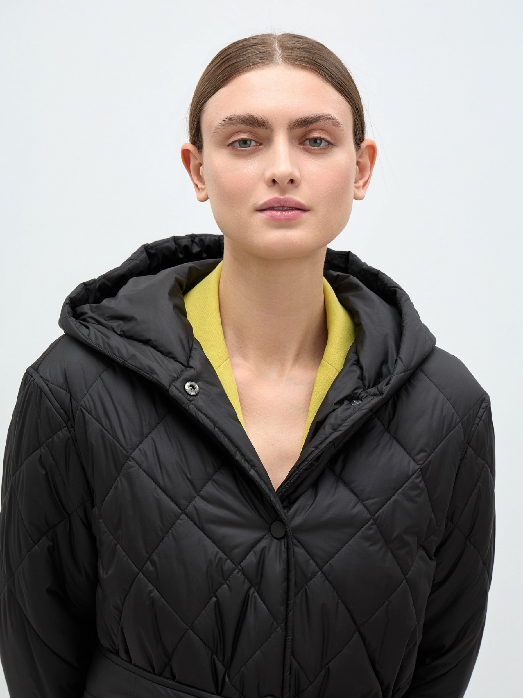 Стеганое пальто с несъемным капюшоном – практичный вариант на первую половину весны или осени. Выполнено из плотной непродуваемой ткани, которая не вбирает в себя грязь, утеплено среднеплотным синтепоном, изнанка закрыта скользящей подкладкой в тон. Градиентная стежка ромб моделирует силуэт, делая портретную зону более аккуратной. Накладные карманы с клапанами и основная застежка – на матовых металлических кнопках в тон. В комплекте тканевый пояс на шлевках. верх: 100% полиэстер; подклад: 100% полиэстер; наполнит: 100% полиэстер