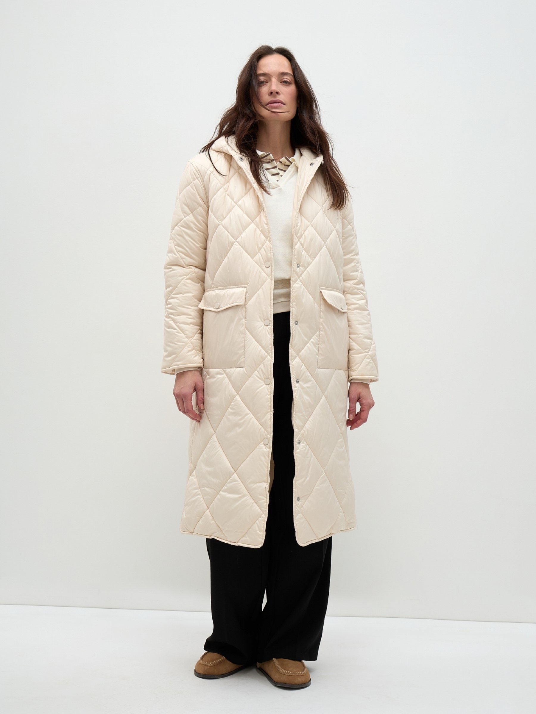 Стеганое пальто с несъемным капюшоном – практичный вариант на первую половину весны или осени. Выполнено из плотной непродуваемой ткани, которая не вбирает в себя грязь, утеплено среднеплотным синтепоном, изнанка закрыта скользящей подкладкой в тон. Градиентная стежка ромб моделирует силуэт, делая портретную зону более аккуратной. Накладные карманы с клапанами и основная застежка – на матовых металлических кнопках в тон. В комплекте тканевый пояс на шлевках. верх: 100% полиэстер; подклад: 100% полиэстер; наполнит: 100% полиэстер