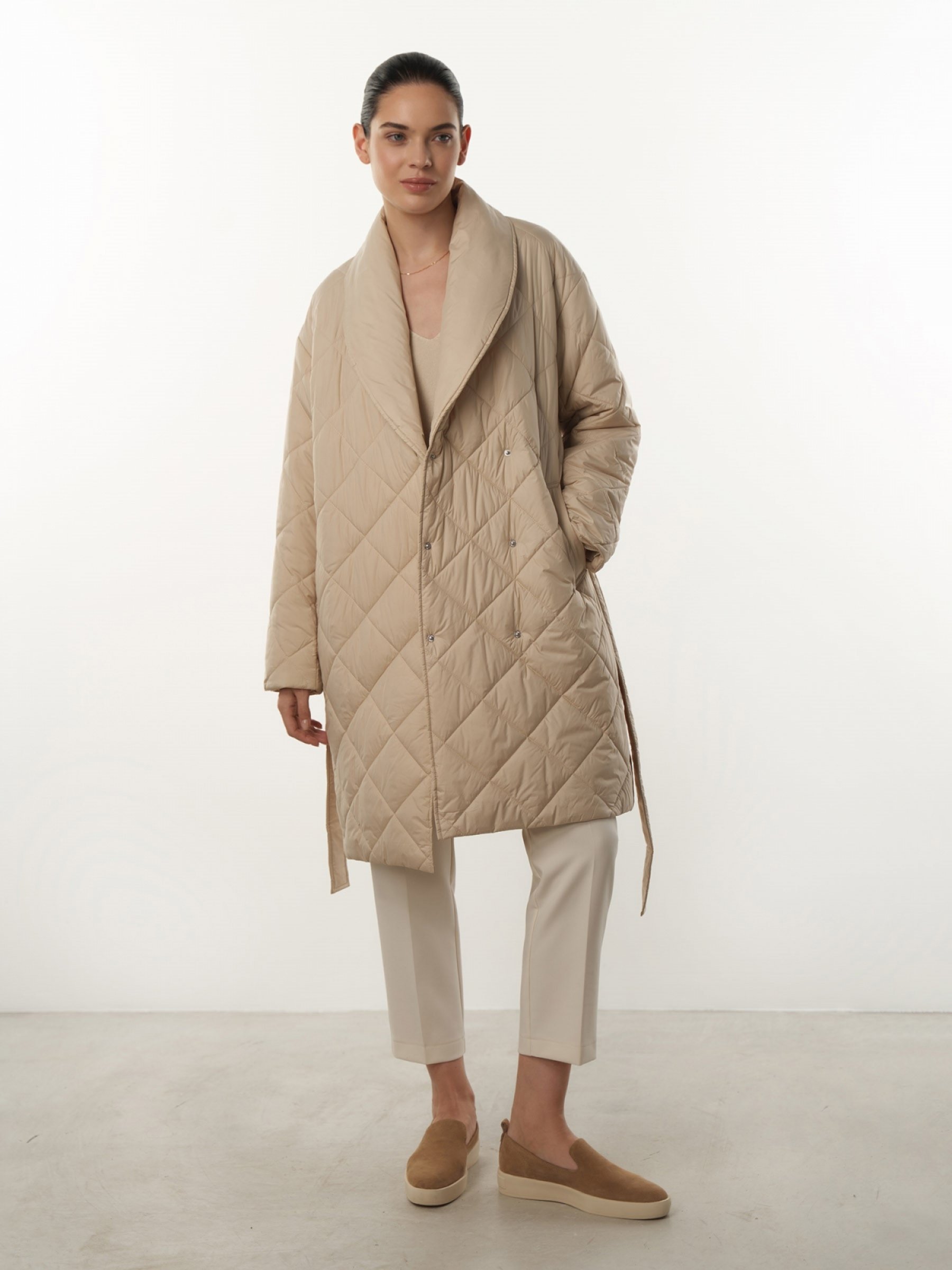 Изящное утепленное двубортное полупальто с оригинальным шалевым воротником подчеркнет вашу женственность. Трендовая ромбовидная стежка актуальна и в новом сезоне. Полупальто выполнено из качественного полиэстера, утеплитель – синтепон. Тканевый пояс на шлевках в тон, удобные прорезные карманы с листочкой на кнопках. Застегивается на два ряда потайных металлических кнопок. Мы выполнили это изделие в трех светлых свежих цветах: лиловом, бежевом и ментоловом. верх: 100% полиэстер; подклад: 100% полиэстер; наполнитель: 100% полиэстер