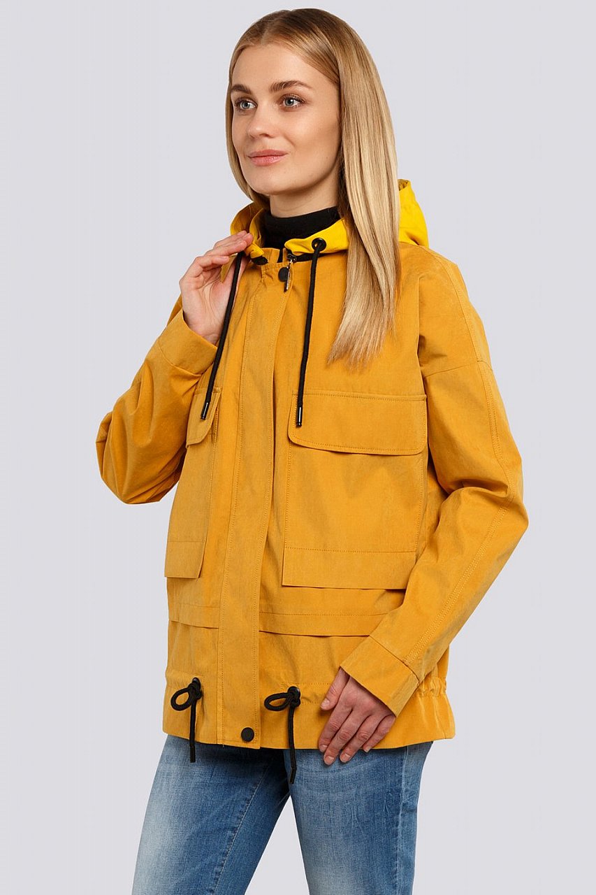 Непостоянная погода любит утраивать нам сюрпризы, и девушки всегда должны быть готовы к любому непредсказуемому погодному явлению. Для нашей нестабильной погоды дизайнеры рекомендуют приобрести ветровку. Ветровка свободного силуэта. На груди большие накладные карманы. Спущенное плечо. По низу рукава манжеты. Низ куртки украшен складкой и кулисой. Молния закрыта планкой. Трикотажный капюшон пристегивается на молнию. Состав ткани: 50% хлопок, 30% вискоза, 20% полиэстер. горчичный