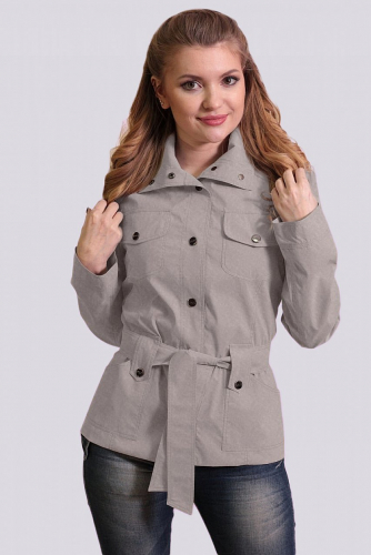 Ветровка на кнопках полуприлегающего силуэта, воротник стойка, нагрудные карманы на кнопках. Завязывающийся пояс в комплекте. Длина рукава 64 см. Состав ткани: 50% хлопок, 30% вискоза, 20% полиэстер, подклад-нейлон 100%.