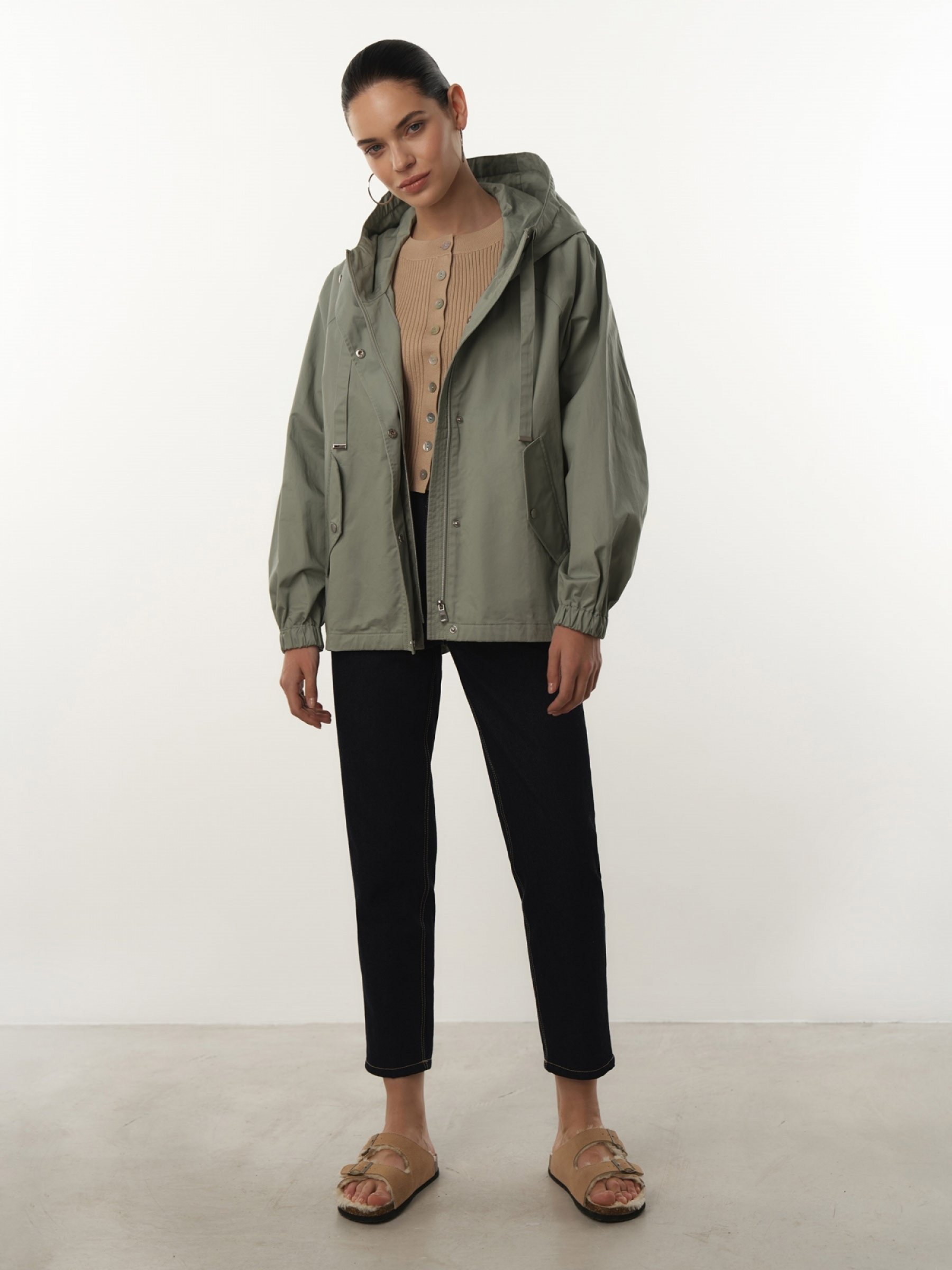 Ветровка с капюшоном незаменима в демисезон. Выполнена из плотного износоустойчивого материала на основе хлопка. Дополнена несъемным объемным капюшоном с регулируемыми завязками в тон и удобными боковыми карманами с клапанами на кнопках. Застегивается на молнию и ряд кнопок. Носите с джинсами и другими любимыми casual-вещами. Ветровка выполнена в трех свежих цветах: ментоловом, голубом и тофу. верх: 65% хлопок, 35% полиэстер; подклад: 100% полиэстер;