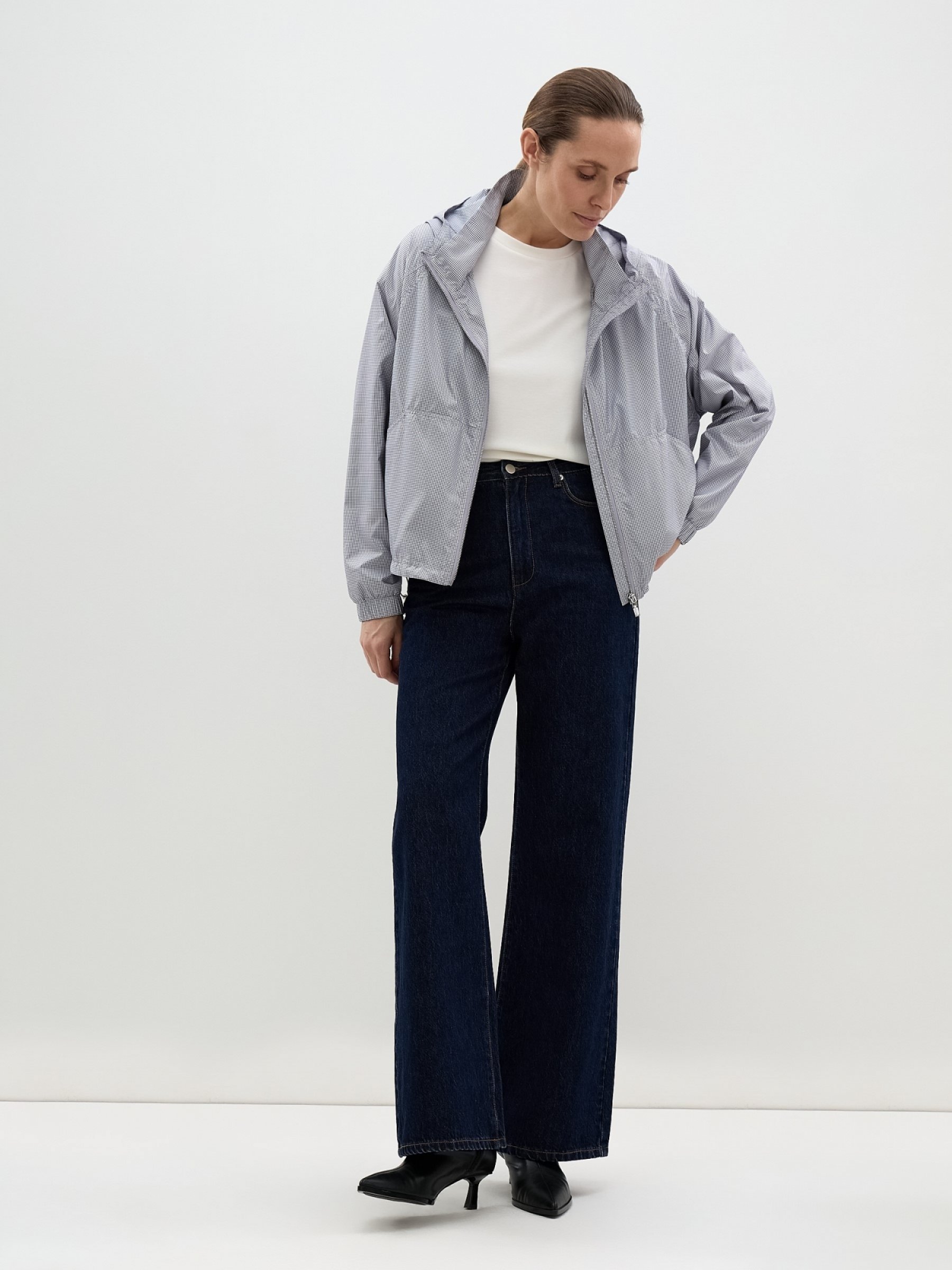 В укороченной ветровке с несъемным капюшоном будет комфортно в теплую погоду. У изделия тонкая струящаяся ткань с подкладкой и скрытая нижняя кулиса с боковыми фиксаторами для регулировки объема и посадки. Передние накладные карманы – удобные и вместительные, поэтому поместится всё необходимое. И, конечно, трендовый принт “гусиная лапка”, который на расстоянии дает эффект мягкого припудренного цвета. Застежка – прочная металлическая молния. верх: 100% полиэстер; подклад: 100% полиэстер;