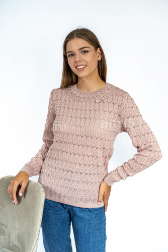 Джемпер женский ж0368 ВЕЛИКАН. Джемпер из тонкого вязаного полотна с фактурным узором. Горловина округлой формы с обтачкой в виде "кокетки", декорированной тесьмой и украшением из металла. Рукав втачной, прямой. Низ изделия и низ рукава на "резинке".