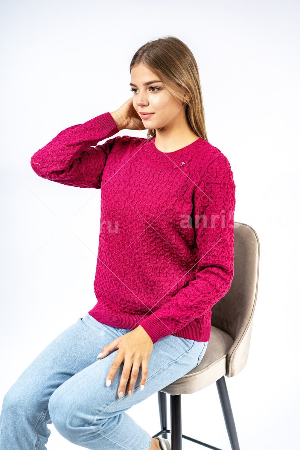 Джемпер из тонкого вязаного полотна с фактурным узором. Горловина округлой формы с обтачкой в виде "кокетки", декорированной тесьмой и украшением из металла. Рукав втачной, прямой. Низ изделия и низ рукава на "резинке". Состав: 30% Шерсть, 70% ПАН.