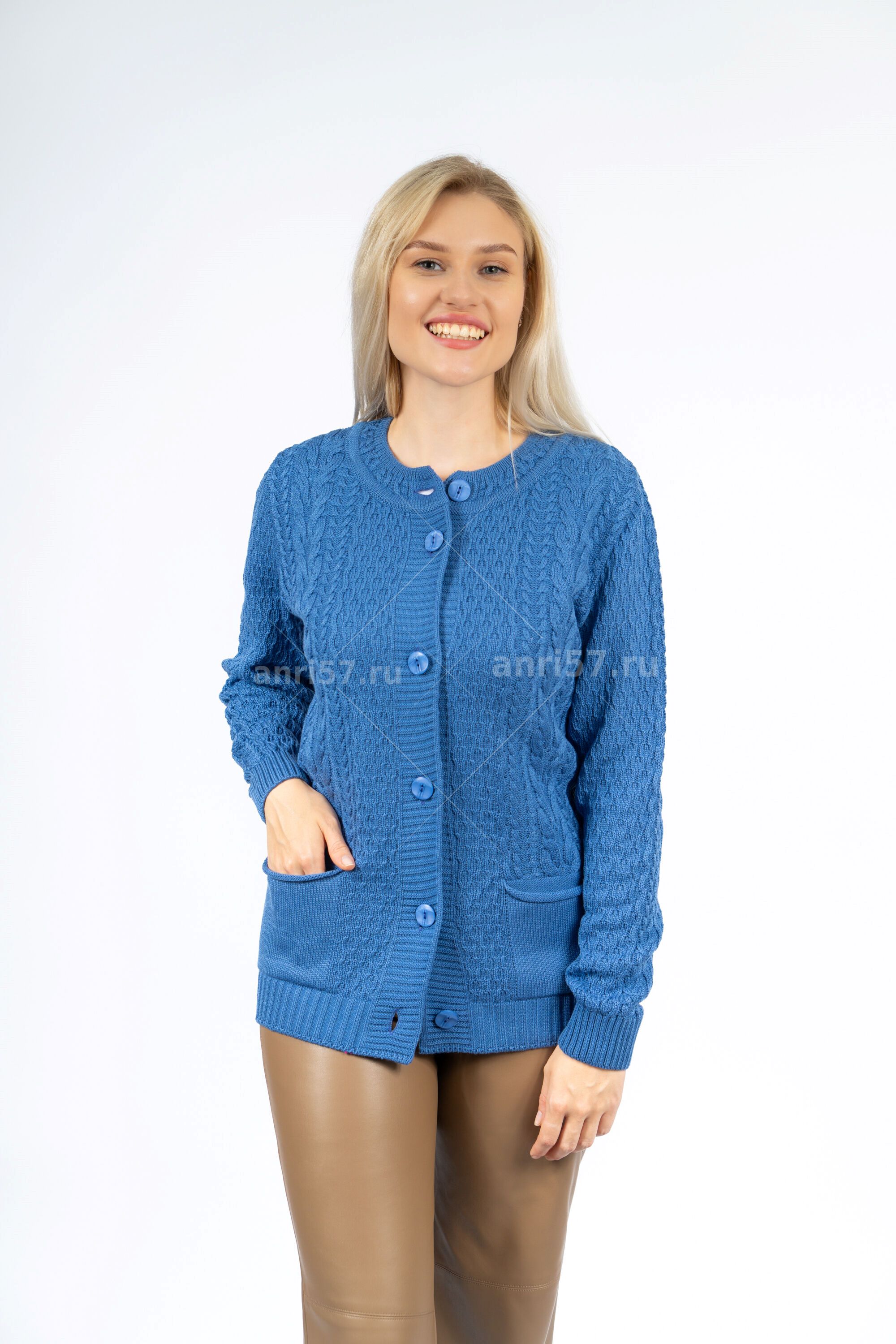 Жакет женский ж0584. Жакет полуприлегающего силуэта из вязаного полотна с центральной застежкой на петли и пуговицы. Горловина округлой формы. Карманы вывязаны. Рукав втачной, на "резинке" по низу.