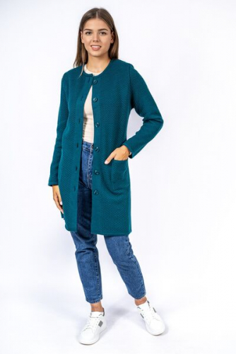 Кардиган женский ж0623.Кардиган полуприлегающего силуэта из фактурного вязаного полотна с центральной застежкой на петли и пуговицы.Горловина округлой формы.Рукав втачной, прямой.На полочках накладные карманы.В боковых швах - разрезы.