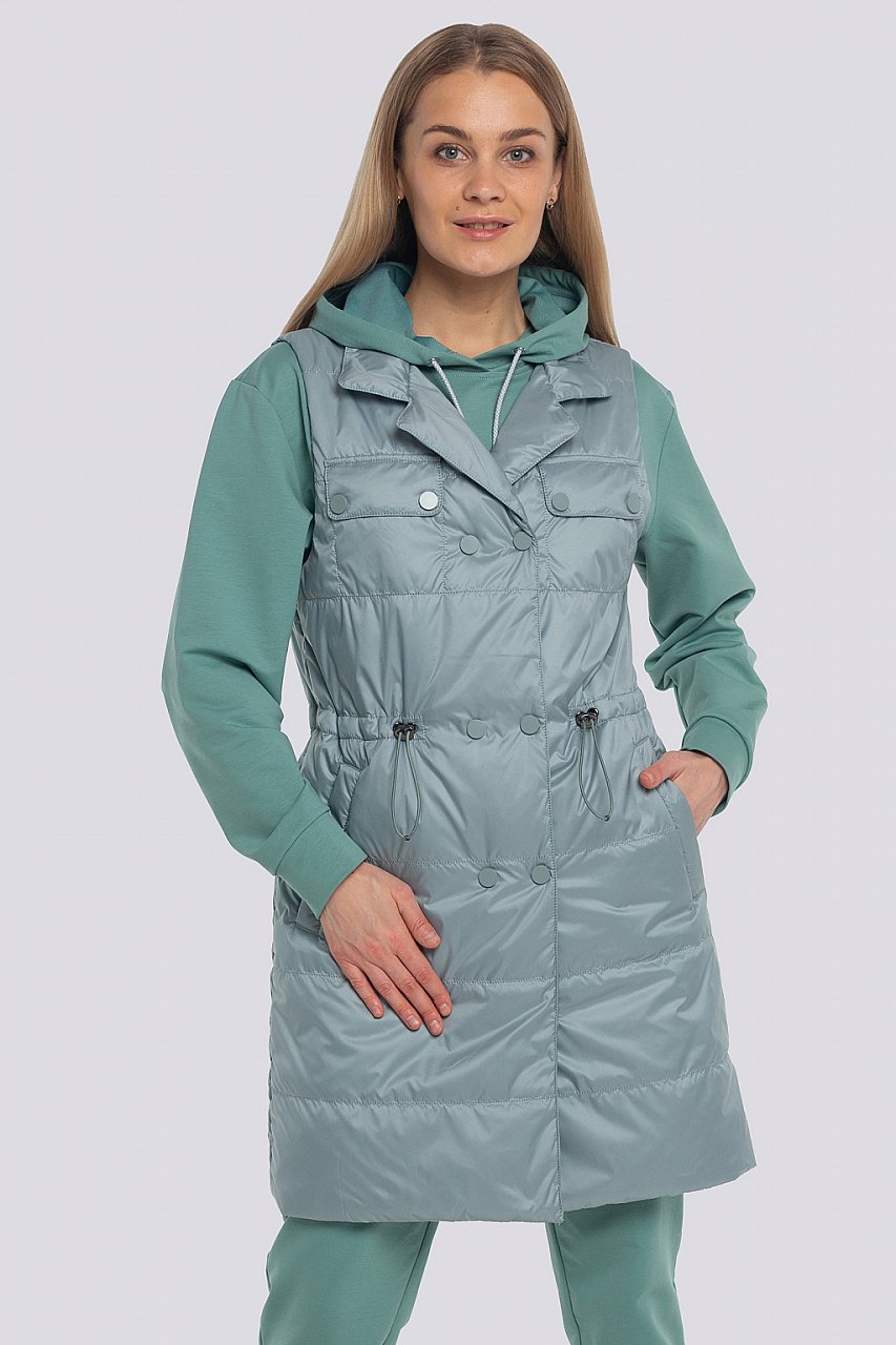 Легкий весенний жилет всегда впишется в ваш гардероб модницы! Он отлично смотрится с любой повседневной одеждой в стиле «Кэжуал». Линия талии регулируется кулисой, удобные карманы, комфортная длина. Воротник – отложной с лацканами, может превратиться в стойку, т.к. предусмотрена внутренняя застежка-магнит. Двойной ряд кнопок по краю борта смотрится оригинально, а также позволяет регулировать объем изделия. Утеплитель - термофин, плотность 100. зеленый чай