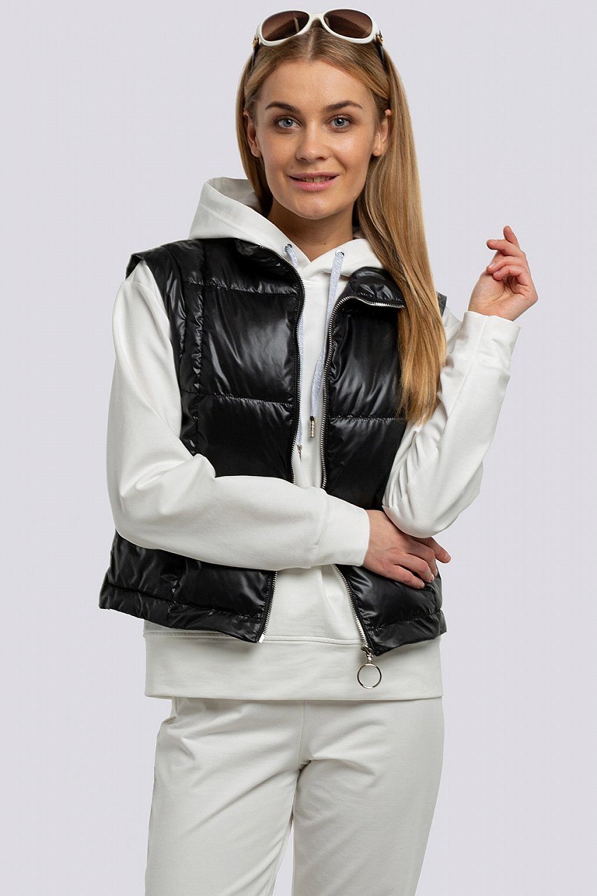 Жилет короткий на синтепухе, прямого силуэта. Застежка на молнии. На подкладке два внутренних кармашка. Воротник стойка. По низу жилетки кулиса , можно отрегулировать объём. Утеплитель синтепух-синтетический пух. черный