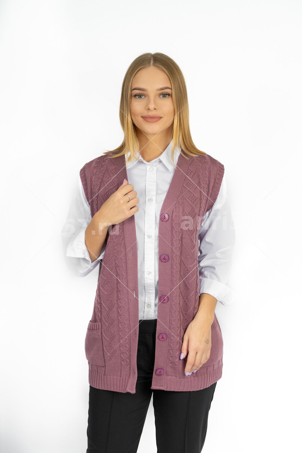 Жилет женский на пуговицах с карманами ж0312. Жилет вязаный, полуприлегающего силуэта с застежкой на петли и пуговицы. На полочках вывязаны карманы, край бортов с планками. Проймы с притачными обтачками.