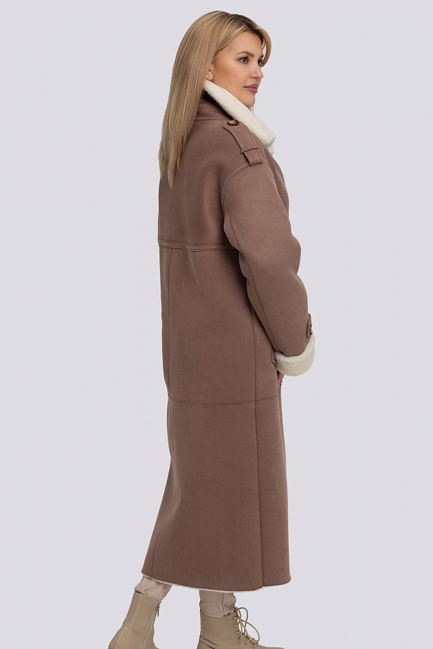 Длинная женская демисезонная дубленка из мягкого плотного экомеха. Застежка на пуговицы. Отложной воротник с лацканами и отворот рукава выполнены меховой стороной наружу. Спущенное плечо обеспечивает хорошую посадку на фигуру любого типа. Теплая и универсальная демисезонная дубленка из экозамши, которую в зависимости от погодных условий можно носить при температуре до -10 градусов. капучино
