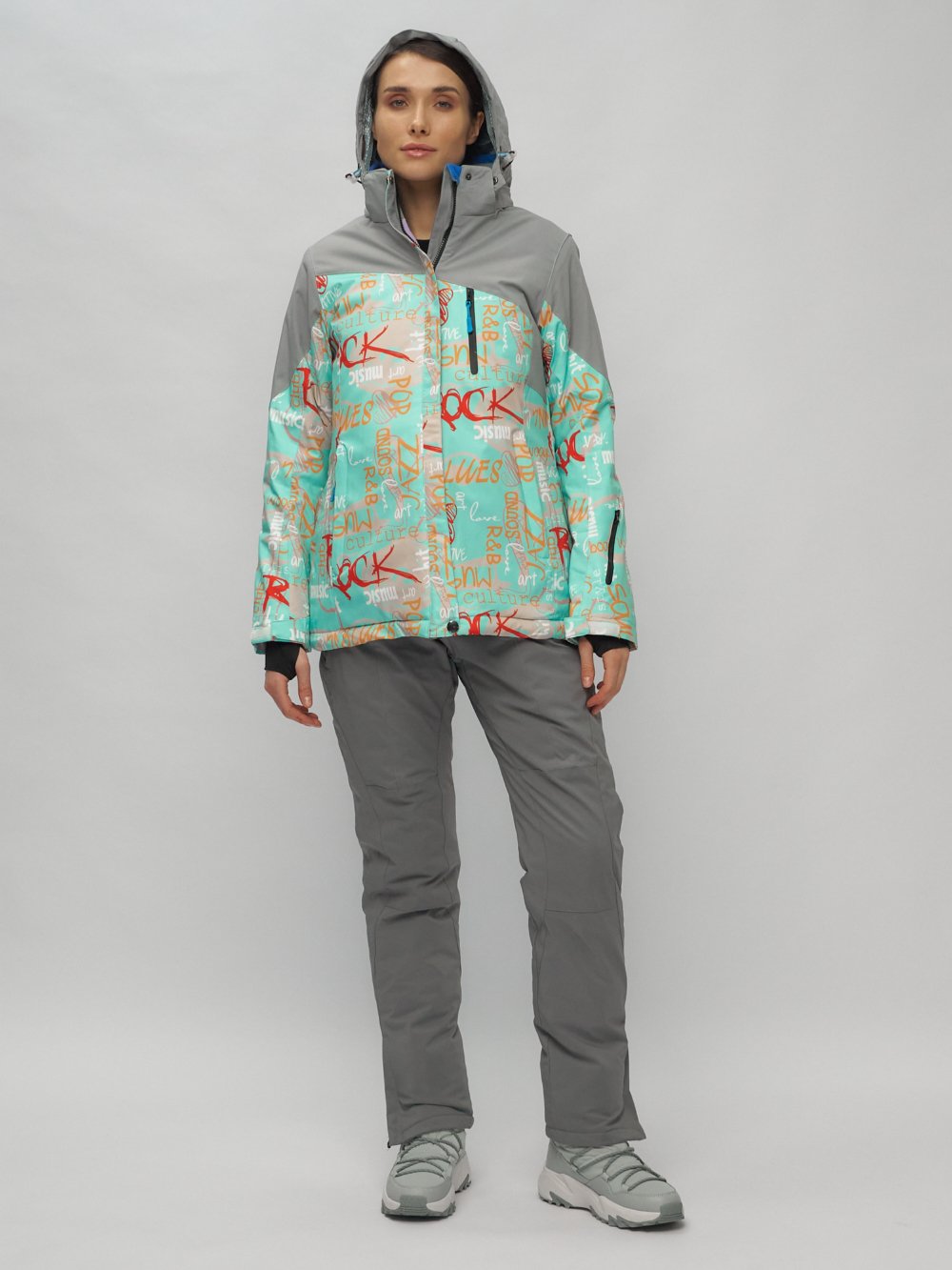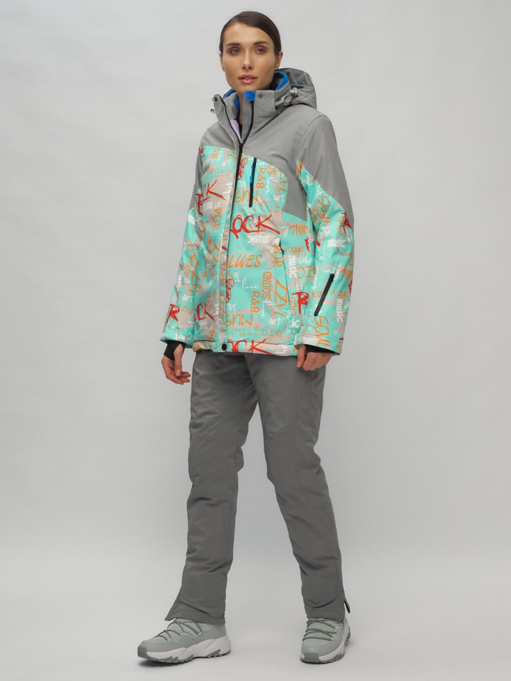 Женский зимний комплект верхней одежды состоит из горнолыжных брюк с бретелями и привлекательной, полуприталенной куртки с разноцветным принтом и принтом надпись. Полукомбинезон женский зимний имеет съемные бретели и спинку, снегозащитные гамаши с эластичной полосой - внутри штанины, расширитель штанин на молнии, застежку крючок, кнопку и молнию, боковые карманы на прорезиненной молнии (водоотталкивающая). Внимание! Бретели полукомбинезона в заказе могут отличаться цветом и принтом. Куртка имеет сетчатую подкладку из ткани TW - сетка Air Mesh, из полиэстера снегозащитную юбку на кнопках, съемный капюшон на молнии с фиксаторами и внутренней сетчатой подкладкой, эластичные полуперчатки с прорезью для пальца, манжеты рукавов на липучке, ветрозащитная планка на кнопках. Функциональность куртке обеспечивает вентиляция под рукавами, фиксатор утяжка по низу куртки.