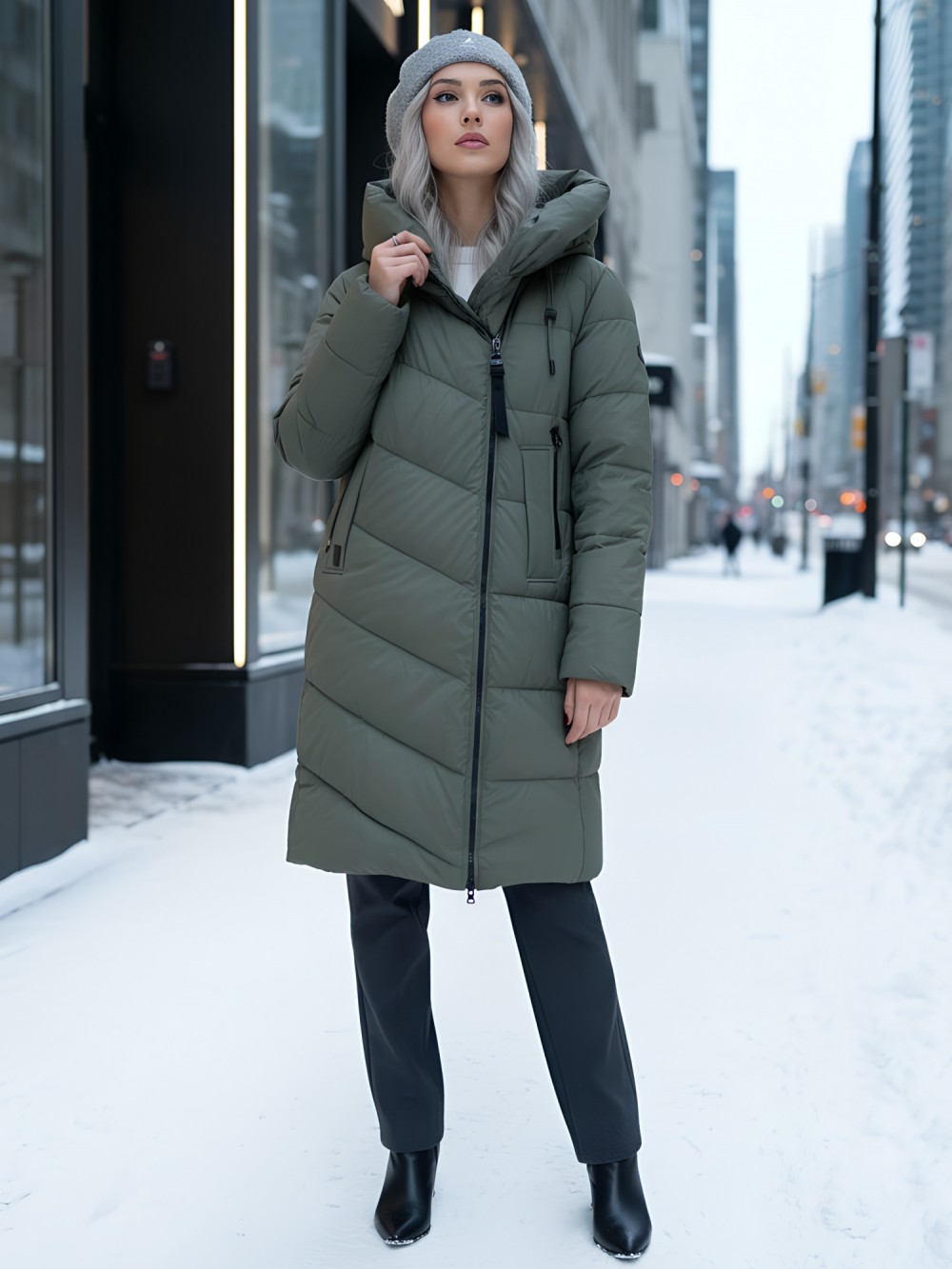 Капюшон не съемный и оснащен фиксатором, а внутренние карманы добавляют удобства. Двойная молния служит надежной застежкой, а проклеенные и прошитые внутренние швы усиливают защиту от ветра. Модель отличается элегантным офисным и повседневным стилем, а гладкая стеганая фактура материала придает ей современный вид.