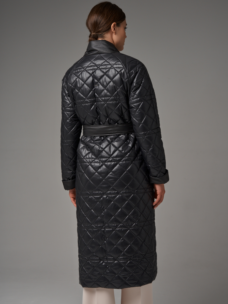 Стеганый плащ-кимоно прямого силуэта. Рукав реглан с заниженной проймой. Застежка на потайные кнопки. В изделии два кармана, оформленных листочками на потайных кнопках и один внутренний карман. В комплекте с плащом идет пояс из основной ткани. Ткань плащевая с водоотталкивающей пропиткой, простеганная ромбом. Утепление нового поколения ORSOTHERM 100 г/м2. Рекомендуемый температурный режим(от +10°C до +18°C). Длина изделия -120 см. Длина рукава - 64 см.