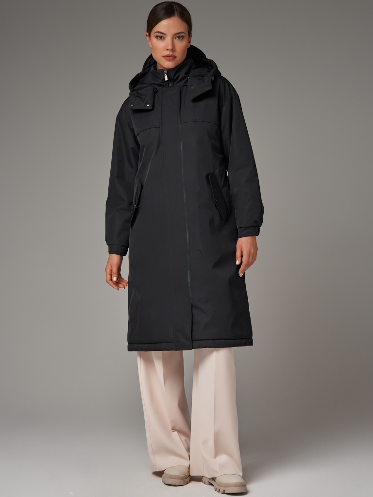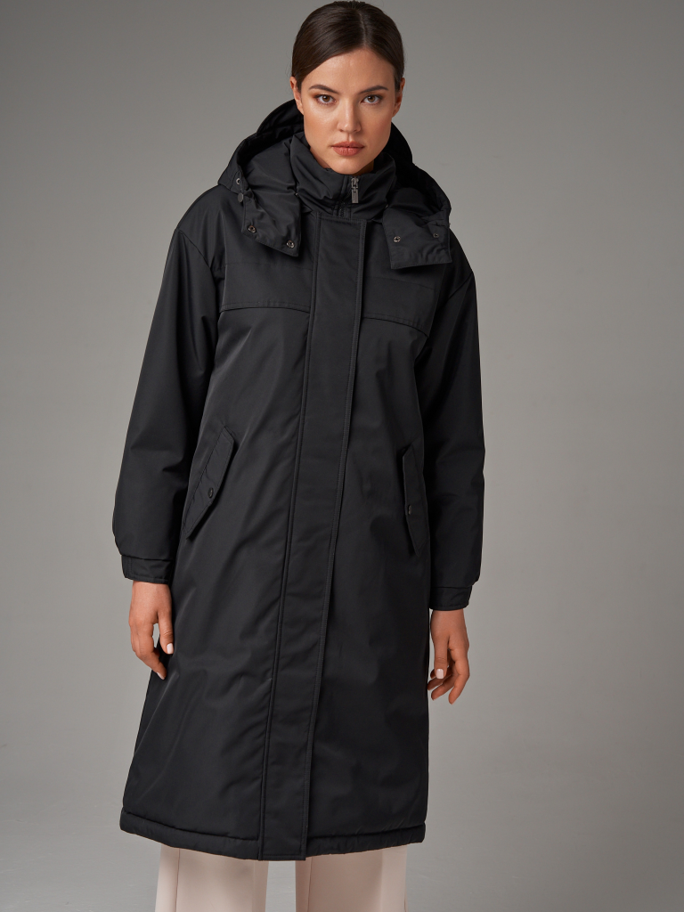 Утепленный плащ прямого силуэта со спущенным рукавом на резинке. Застежка на молнию в цвет изделия и на потайные кнопки. В изделии два функциональных кармана и один внутренний. Капюшон отстежной. Рукав втачной со спущенной линией плеча. По спинке изделия по линии талии есть утяжка с выходом на подкладку. Плащ выполнен из ткани на мембране с качественной водоотталкивающей пропиткой. Температурный режим изделия (от +10°C до +18°C). Утеплитель нового поколения ORSOTERM.150 г/м2.