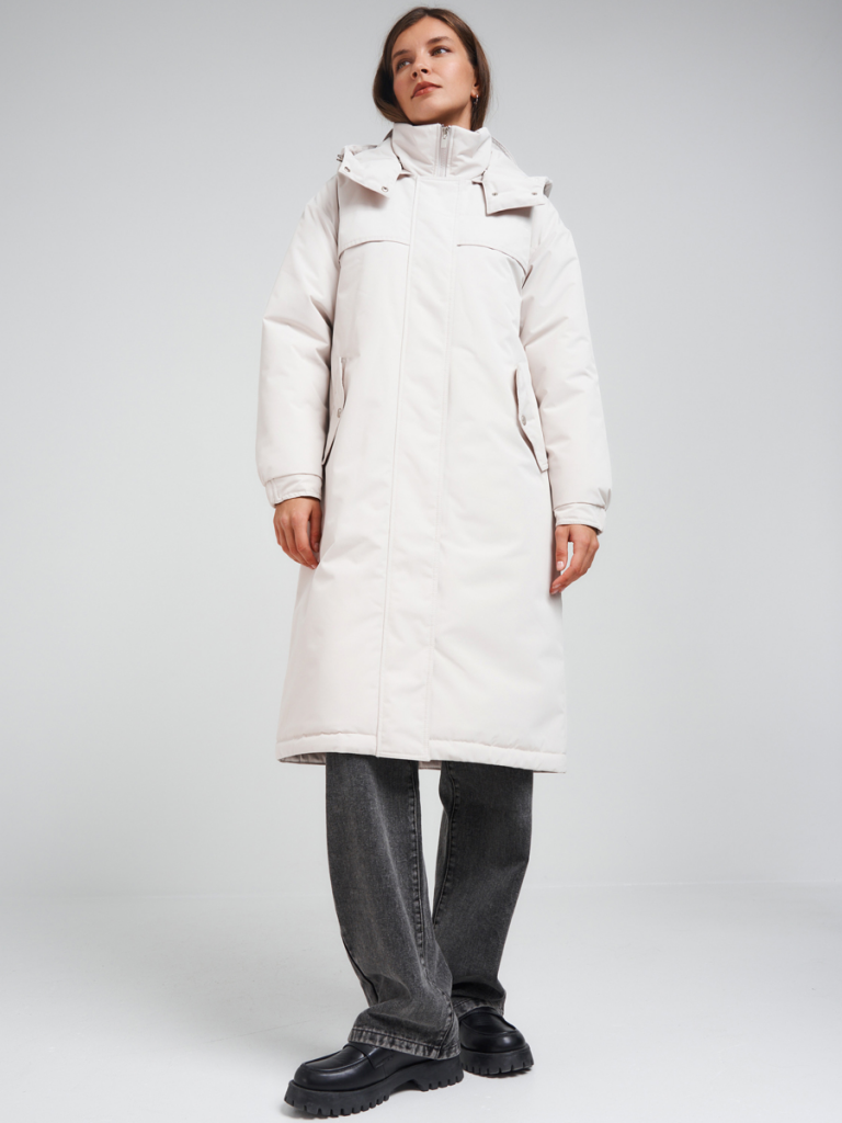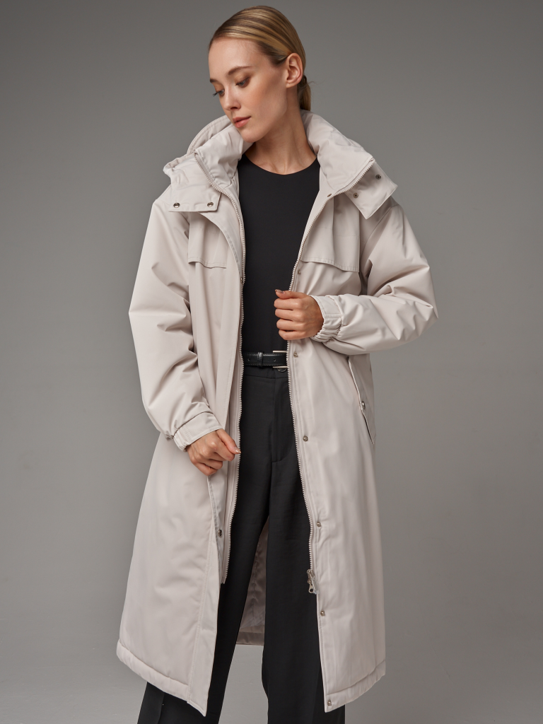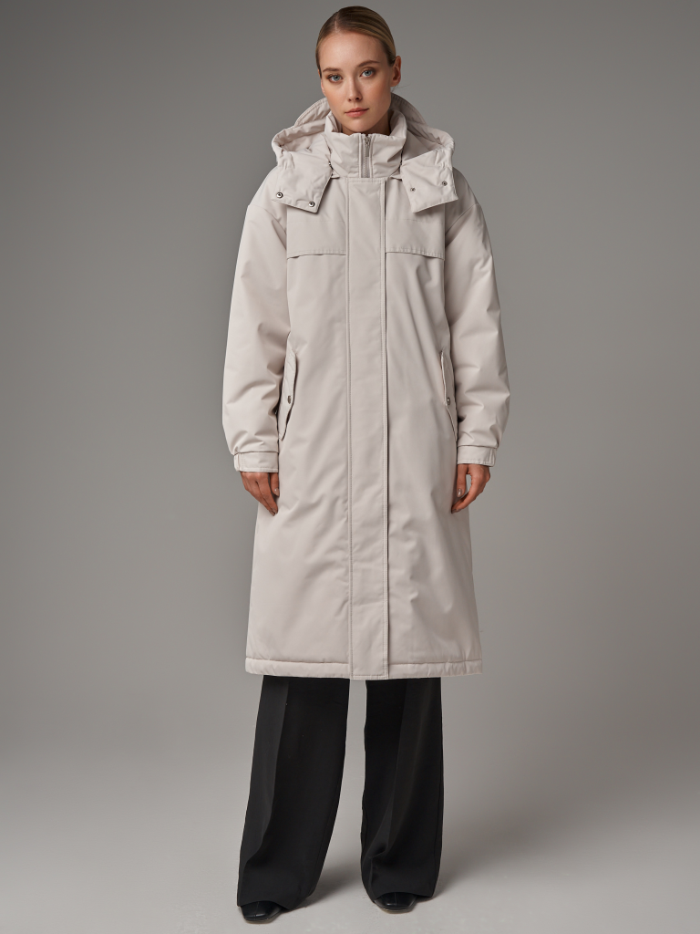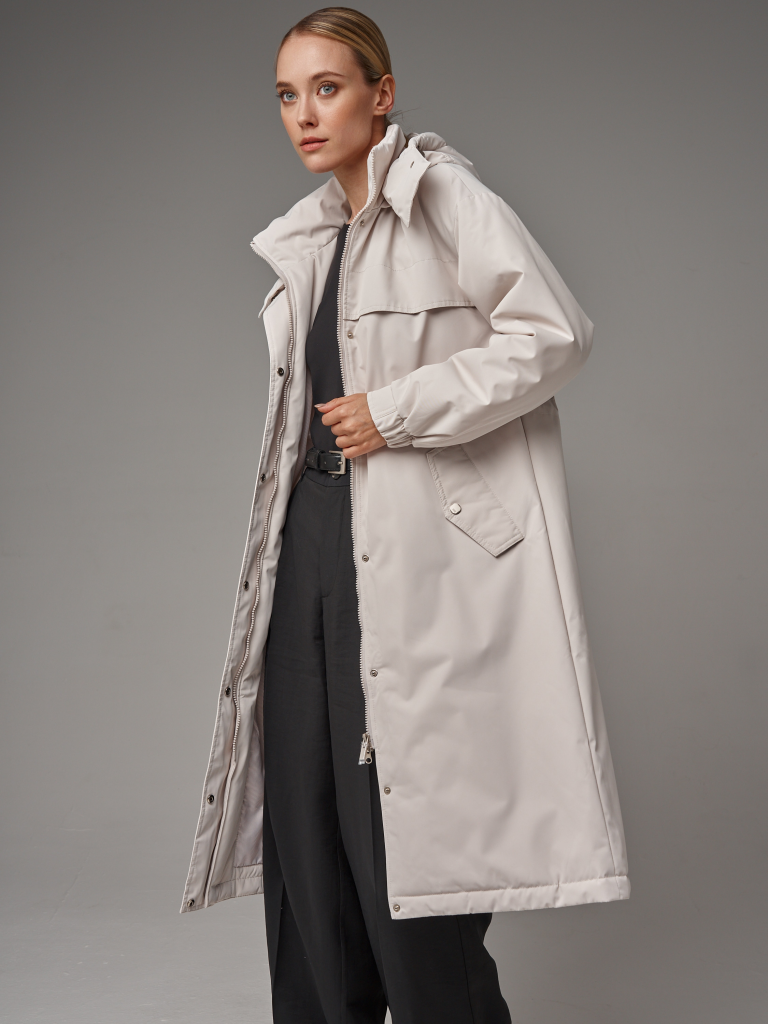 Утепленный плащ прямого силуэта со спущенным рукавом на резинке. Застежка на молнию в цвет изделия и на потайные кнопки. В изделии два функциональных кармана и один внутренний. Капюшон отстежной. Рукав втачной со спущенной линией плеча. По спинке изделия по линии талии есть утяжка с выходом на подкладку. Плащ выполнен из ткани на мембране с качественной водоотталкивающей пропиткой. Температурный режим изделия (от +10°C до +18°C). Утеплитель нового поколения ORSOTERM.150 г/м2.