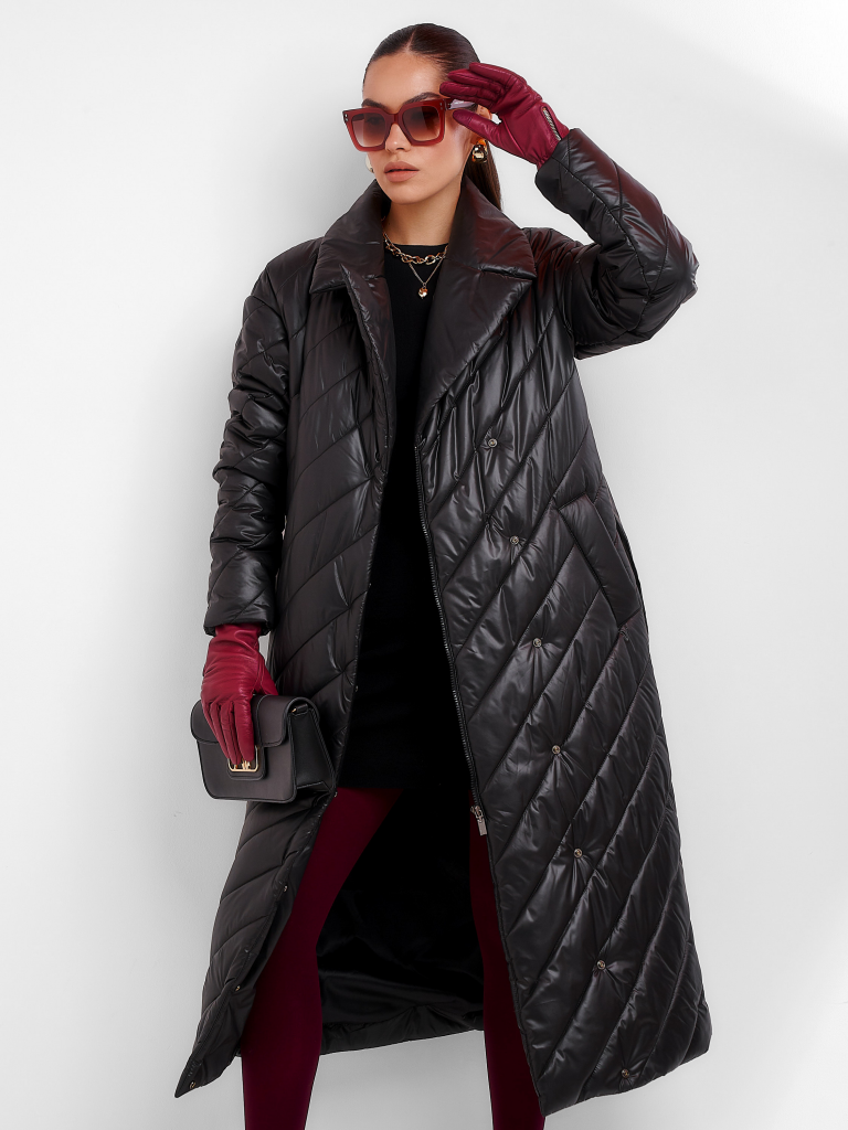 Детали: воротник с лацканами, застежка на молнию и потайные кнопки.