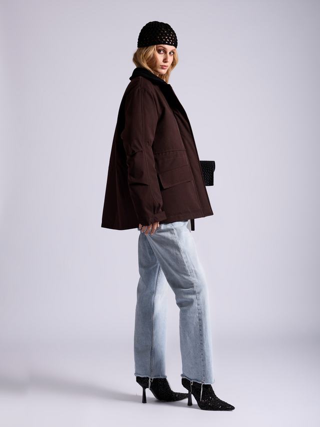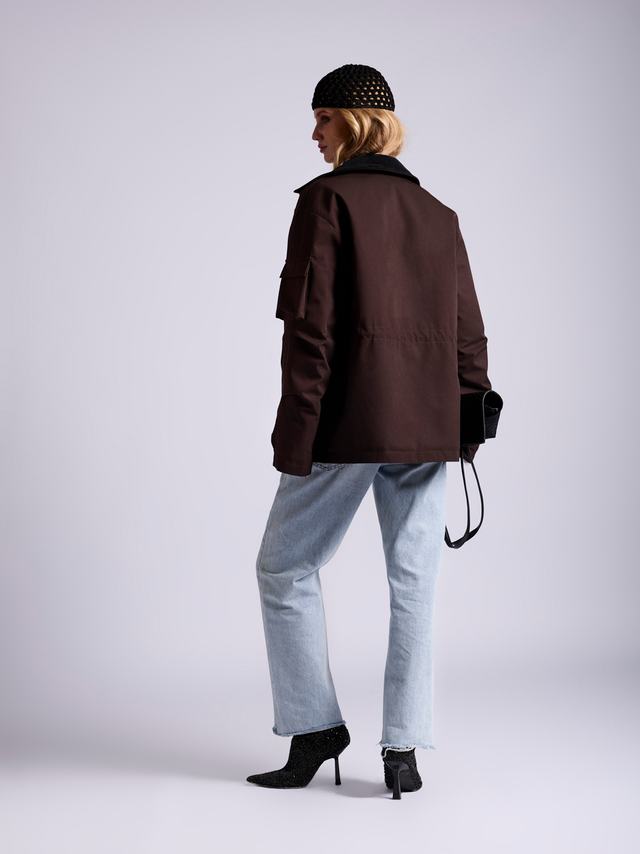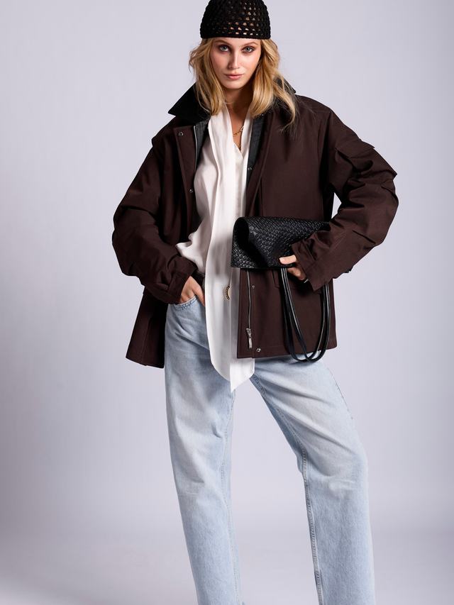 Модель выдерживает идеальный баланс между женственностью и эстетикой грубой рабочей одежды. Силуэт от прямого до приталенного регулируется кулиской во внутренней части изделия.