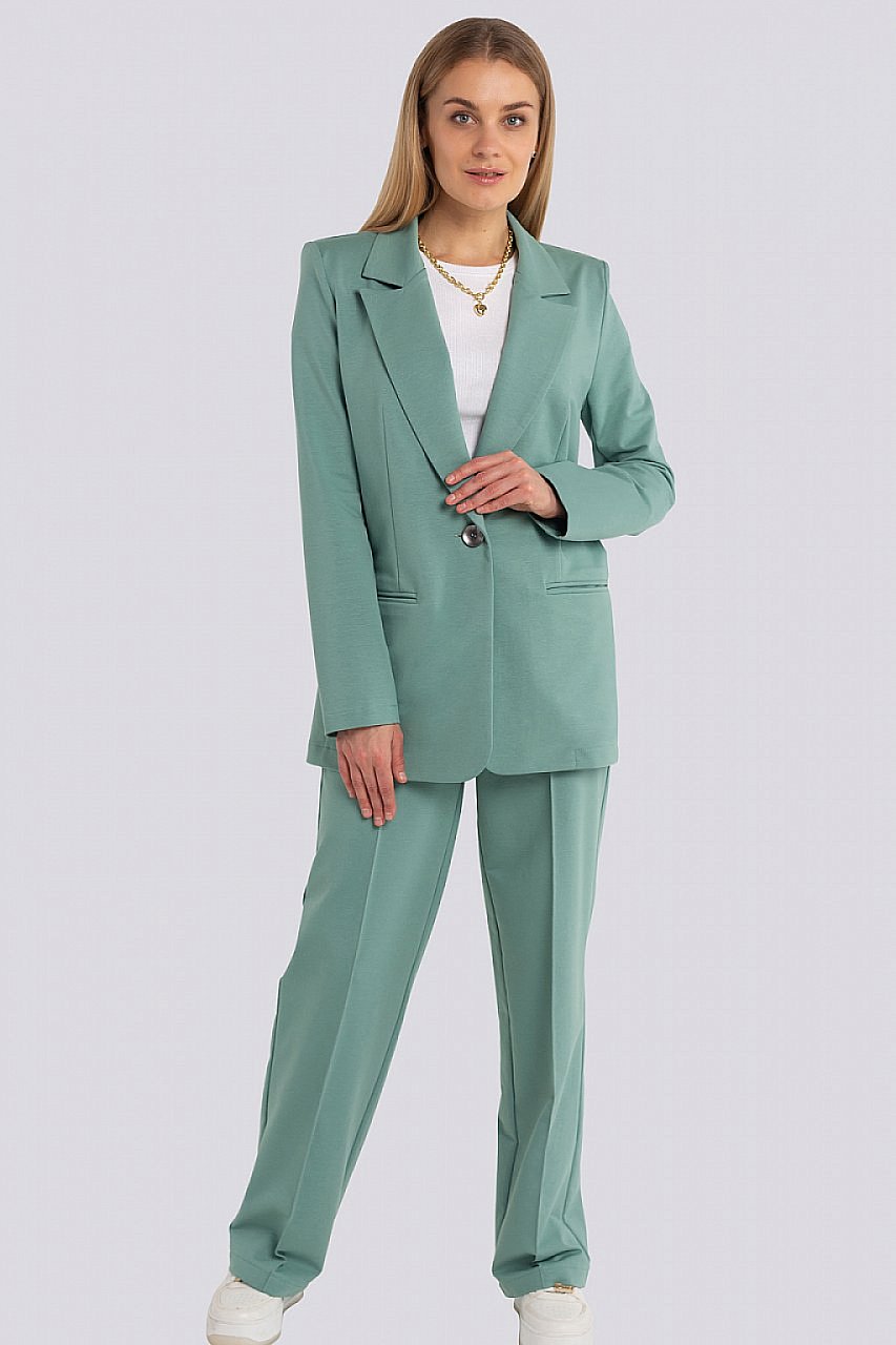 Классический костюм всегда был в моде, такие костюмы подходят всем, независимо от фигуры. Их можно носить с блузками, рубашками, для того, чтобы создать строгий образ. Для повседневного ношения можно надеть свитер или топ. Современные женщины готовы носить модный костюм с брюками по любому поводу и это правильно. Более того, женский брючный костюм входит в топ вещей, без которых представить себе актуальный женский гардероб в сезоне 2023-2024 будет немыслимо. Жакет с воротником английского типа, свободного объема, полуприлегающего силуэта. Застежка на пуговицу, элегантные карманы в рамку. Брюки широкие, стрелка застрочена, со шлевками, пояс частично с резинкой. Посадка брюк – высокая, на талии. В очередной раз пришла в моду палитра сочных оттенков – фуксия, ярко-синий, зеленая мята – наш выбор. Модель представлена из трикотажной ткани, что предоставляет максимум комфорта в носке. Ткань не мнется, не вытягивается и не выгорает. Состав трикотажа: 75% хлопок, 20% полиэстер, 5% спандекс. зеленая мята