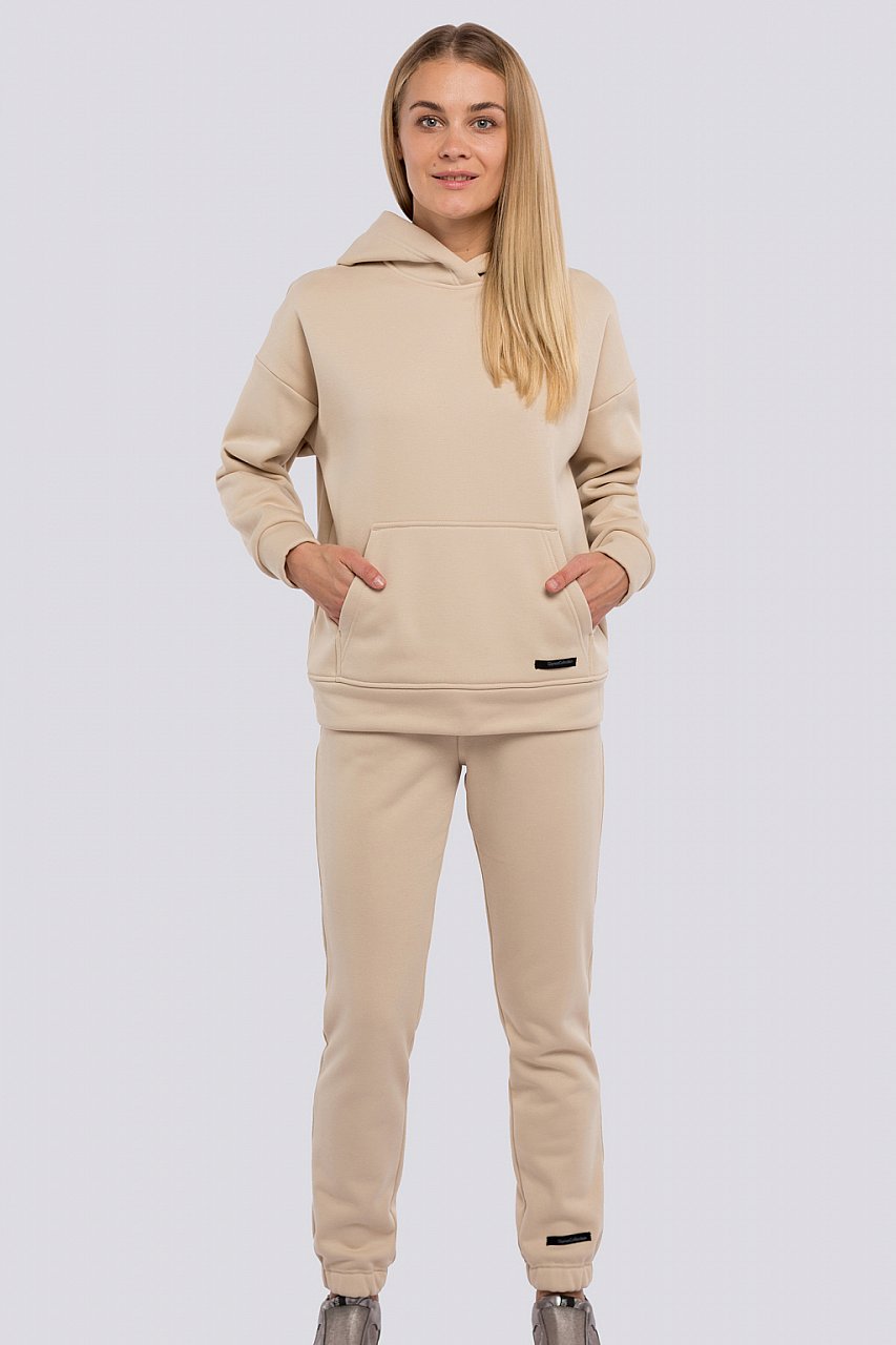 Тренд на расслабленные и комфортные вещи, которые не сковывают движения и дарят ощущение уюта, — один из основных в новом сезоне. Поэтому трикотажный костюм, состоящий из толстовки и брюк, наиболее соответствует данным тенденциям. Толстовка «оверсайз» с капюшоном, низ изделия и низ рукава обработаны поясом и манжетами. Брюки свободные, пояс и низ брюк на резинке. Трикотаж утепленный на флисе, состав: 75% хлопок, 20% полиэстер, 5% спандекс. бежевый