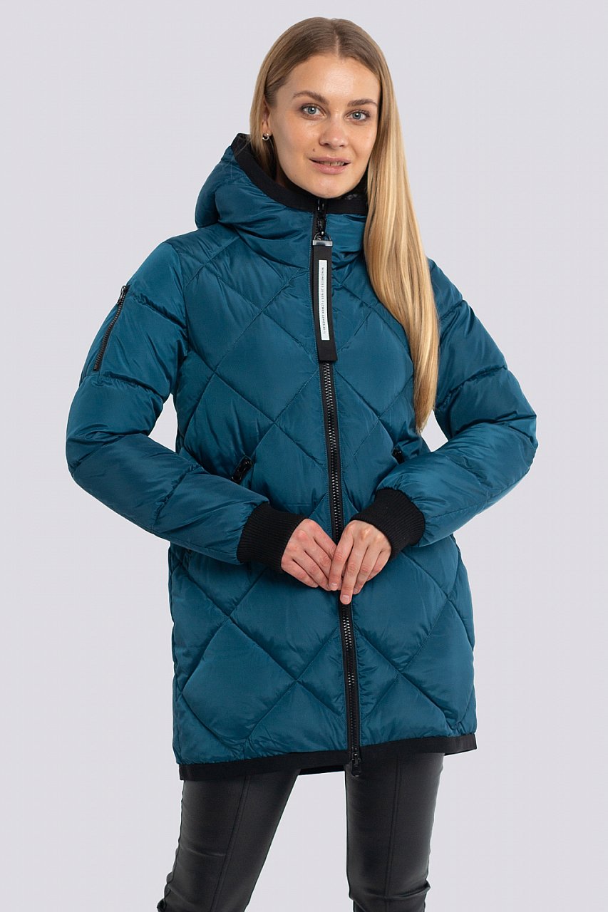 Универсальный хит –женская стеганая куртка с капюшоном из плотной плащевой ткани. Куртка прямого силуэта с ромбовидной стежкой на передней части изделия и фигурной стежкой на спинке. Центральная застежка на молнию, прорезные удобные карманы. Отделка трикотажной бейкой смотрится очень эффектно. В качестве утеплителя мягкий и практичный синтепух-синтетический пух. Температурный режим до -15. морская волна