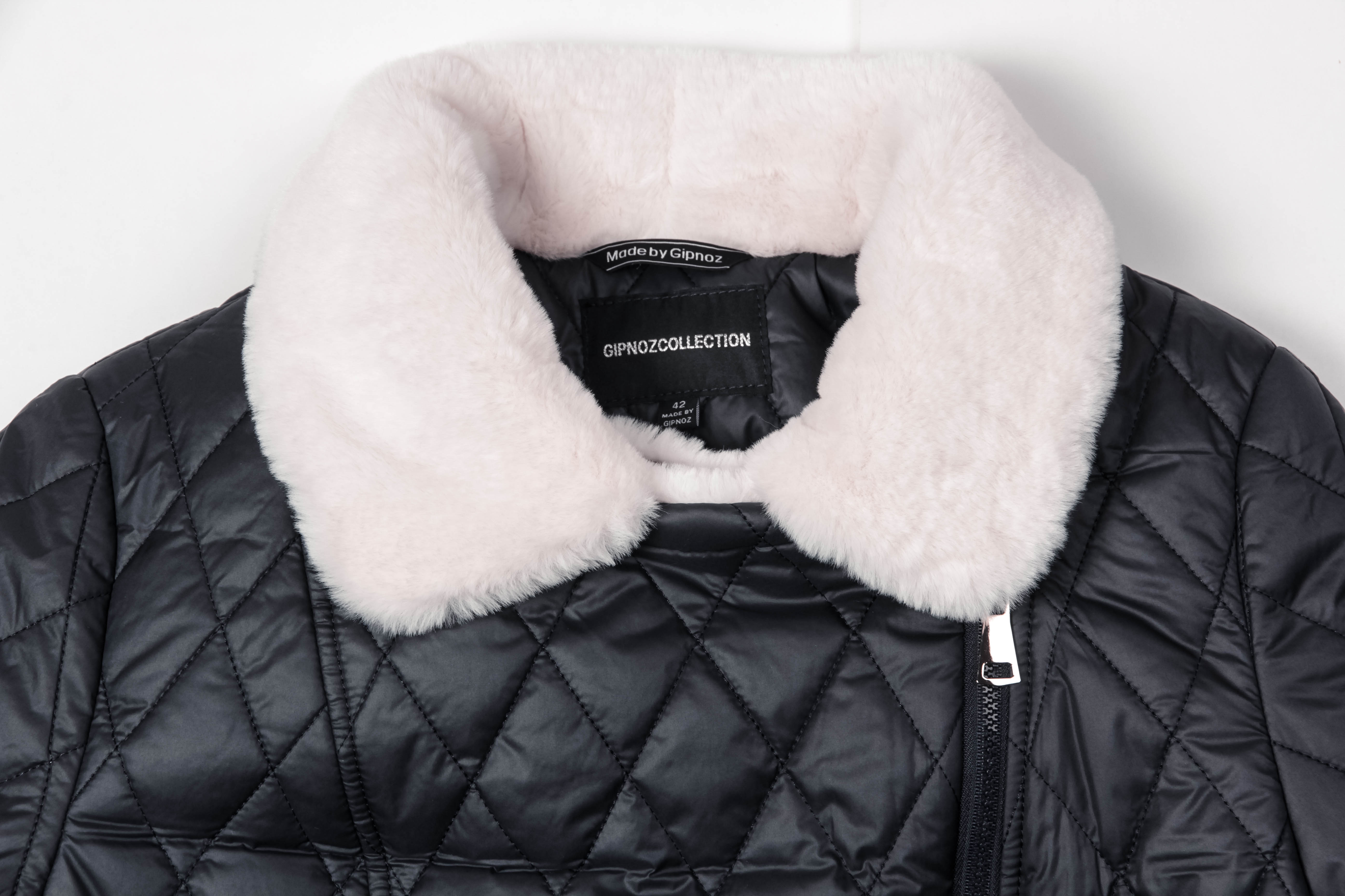 Классная куртка-косуха является незаменимым атрибутом современной женщины. Наша модель выполнена из стеганой ткани, она легкая, комфортная в носке, сочетается с любой одеждой. Объем изделия умеренный, силуэт прямой, втачной покрой рукава выигрышно смотрится на любой фигуре. Застежка на молнию, застегивается до верха, а также раскладывается на отложной воротник с лацканами. Спинка по линии низа собрана на резинку. Рукав загибается на манжет. Экомех молочного цвета невероятно мягкий, красиво смотрится у лица. Мех отлично переносит стирку в машинке (деликатный режим), при высушивании его рекомендуется расчесать щеткой, чтобы сохранить первоначальный вид. Утеплитель термофин, плотность 160. Температурный режим до -5. черно-синий