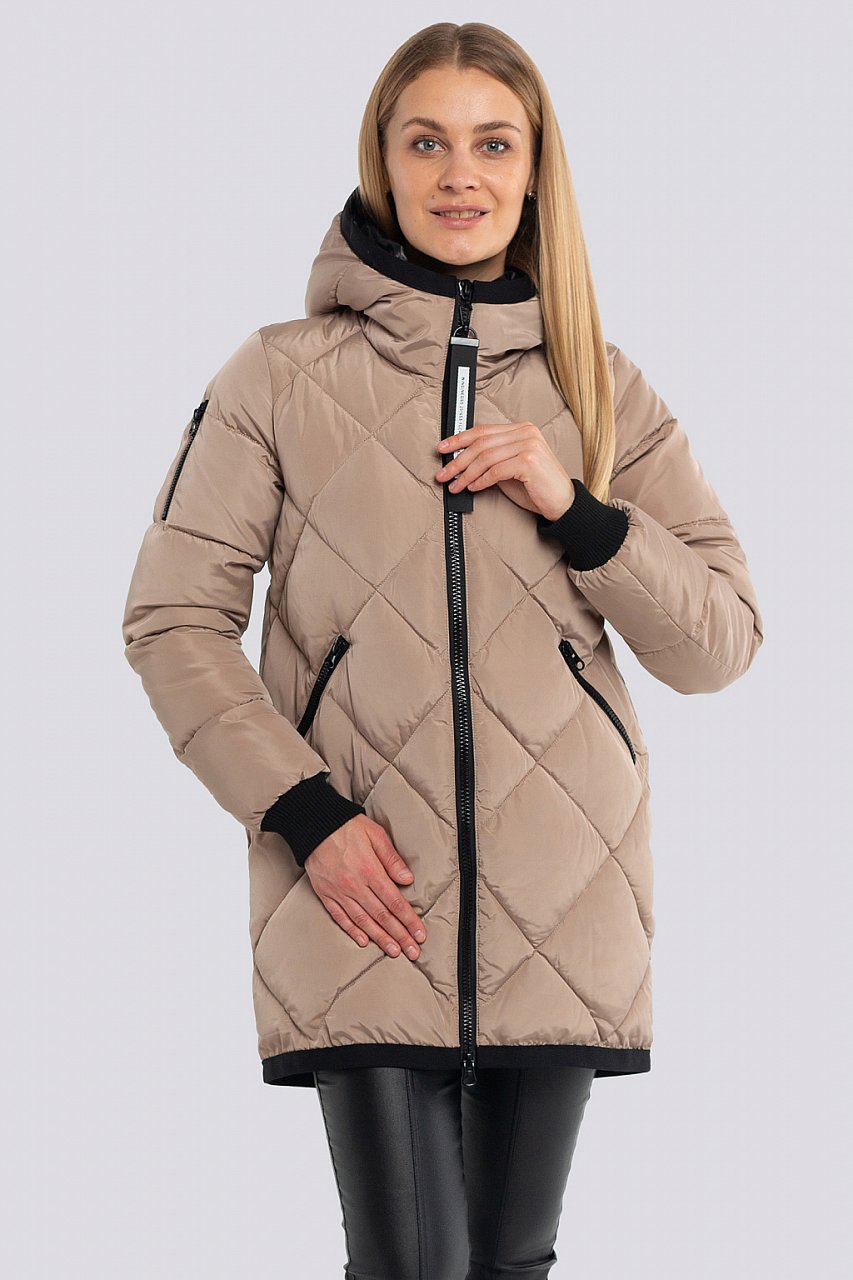 Универсальный хит –женская стеганая куртка с капюшоном из плотной плащевой ткани. Куртка прямого силуэта с ромбовидной стежкой на передней части изделия и фигурной стежкой на спинке. Центральная застежка на молнию, прорезные удобные карманы. Отделка трикотажной бейкой смотрится очень эффектно. В качестве утеплителя мягкий и практичный синтепух-синтетический пух. Температурный режим до -15. латте