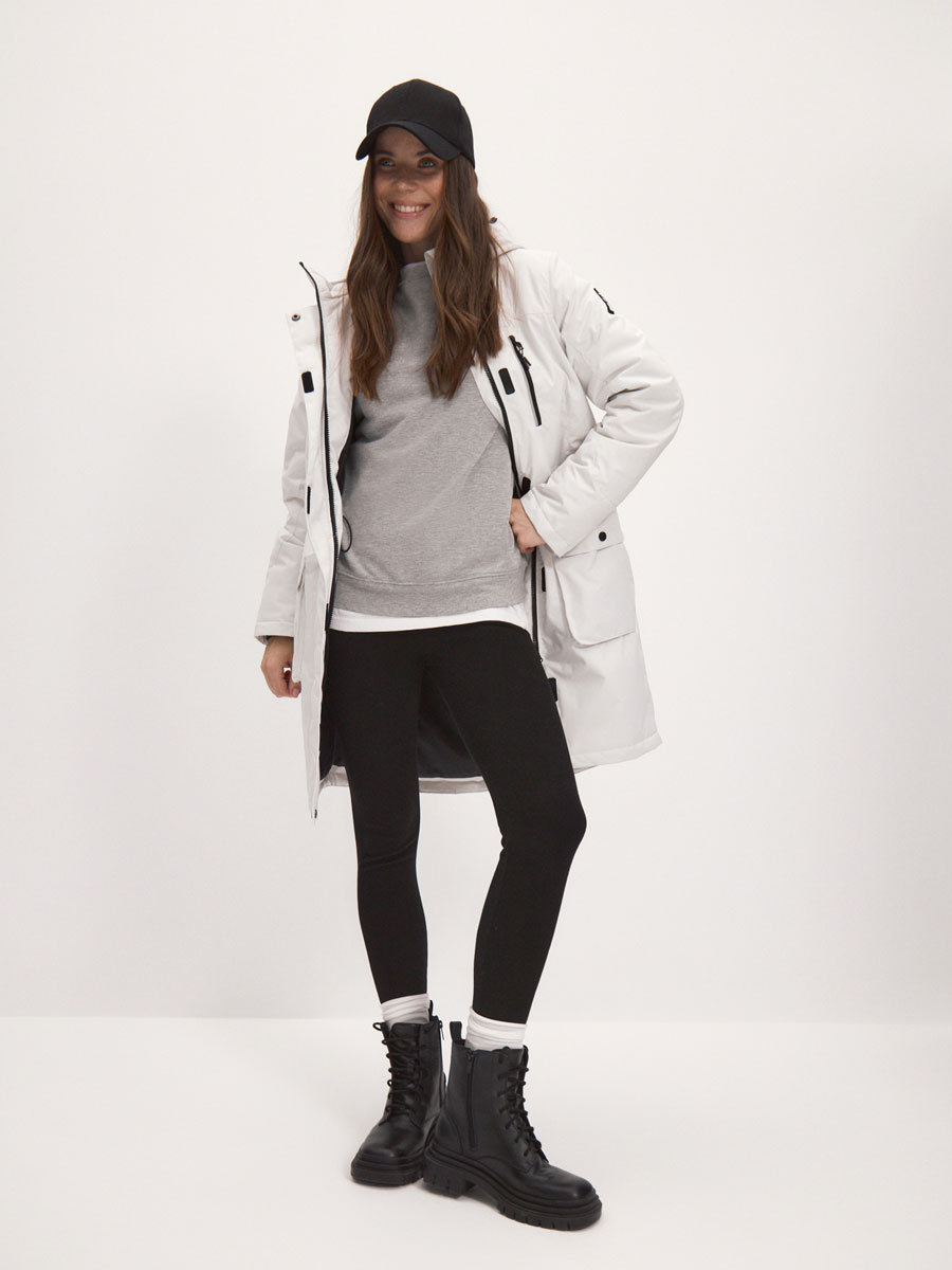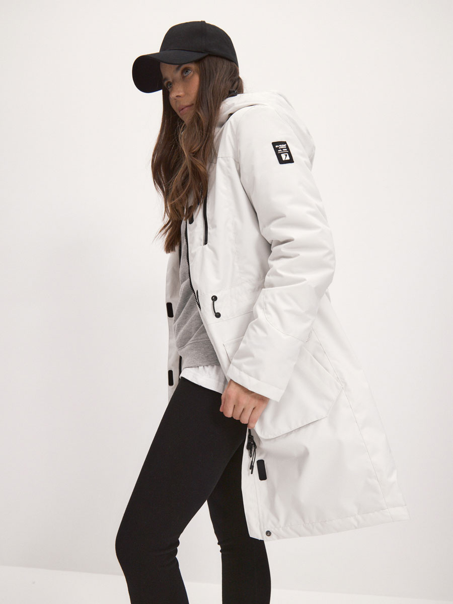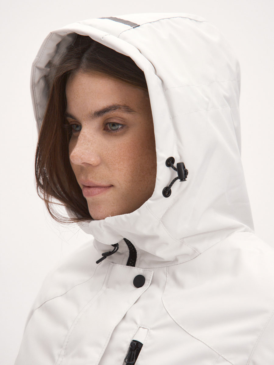 Удлиненная куртка для женщины из влагостойкой, дышащей ткани. Застежка на молнию, закрытая планкой на кнопках и липучках. Подкладка комбинированная из флиса и шелка. Втачной капюшон с флисовой подкладкой. 3 наружных кармана различной конфигурации. Рассчитана на температуру от -5 до +10.