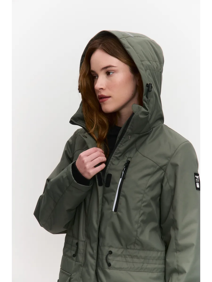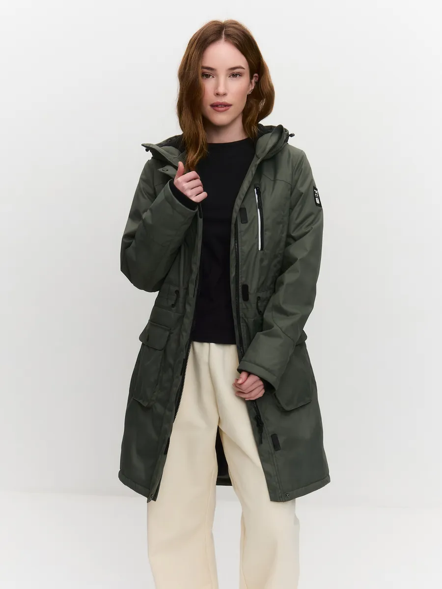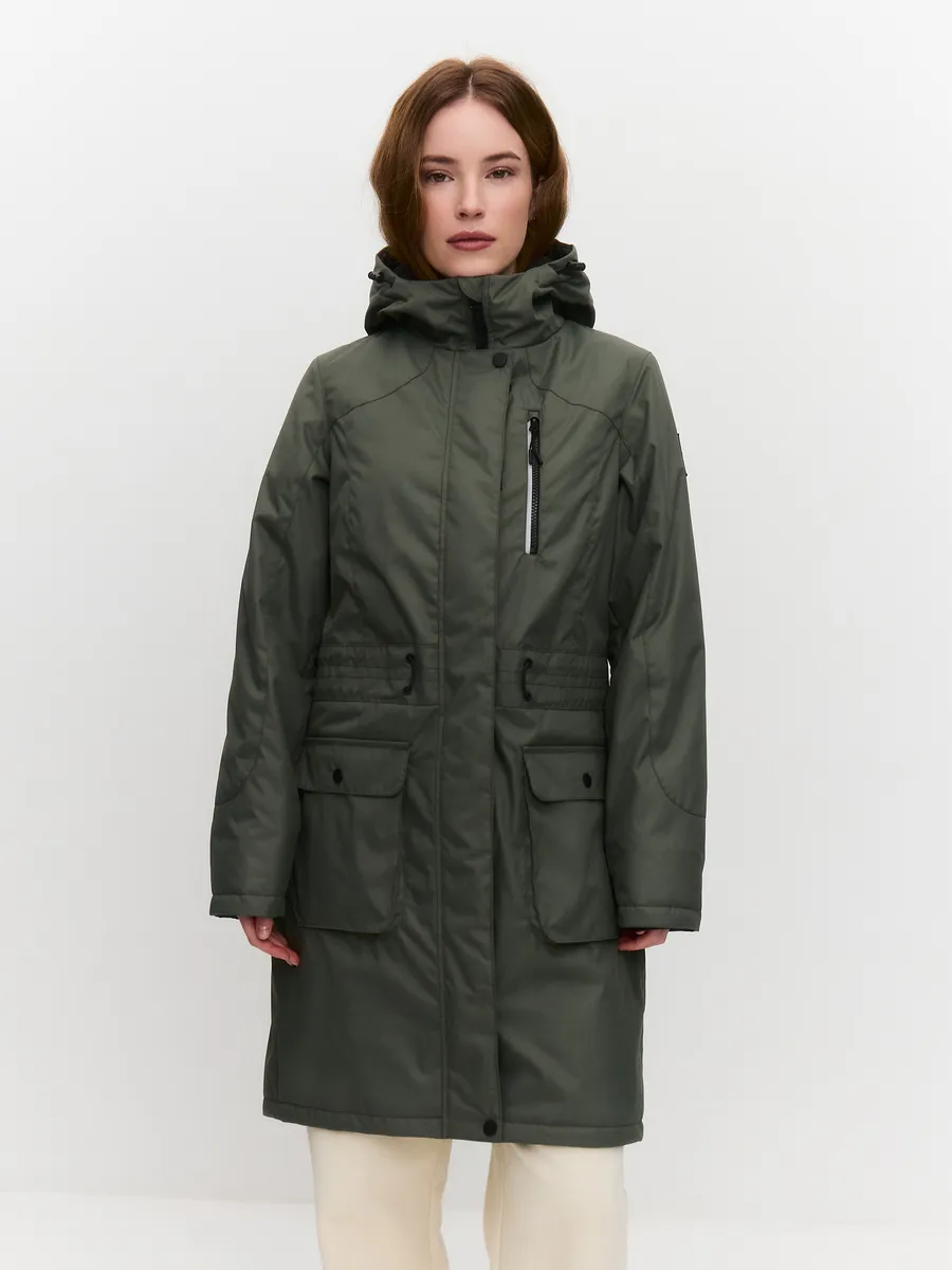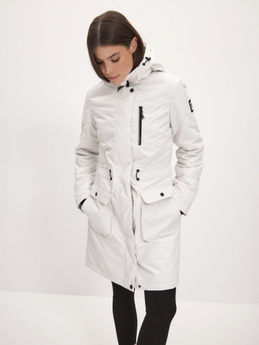 Удлиненная куртка для женщины из влагостойкой, дышащей ткани. Застежка на молнию, закрытая планкой на кнопках и липучках. Подкладка комбинированная из флиса и шелка. Втачной капюшон с флисовой подкладкой. 3 наружных кармана различной конфигурации. Рассчитана на температуру от -5 до +10.