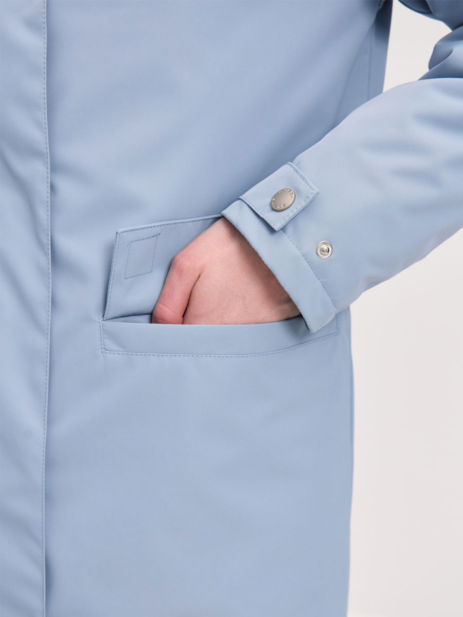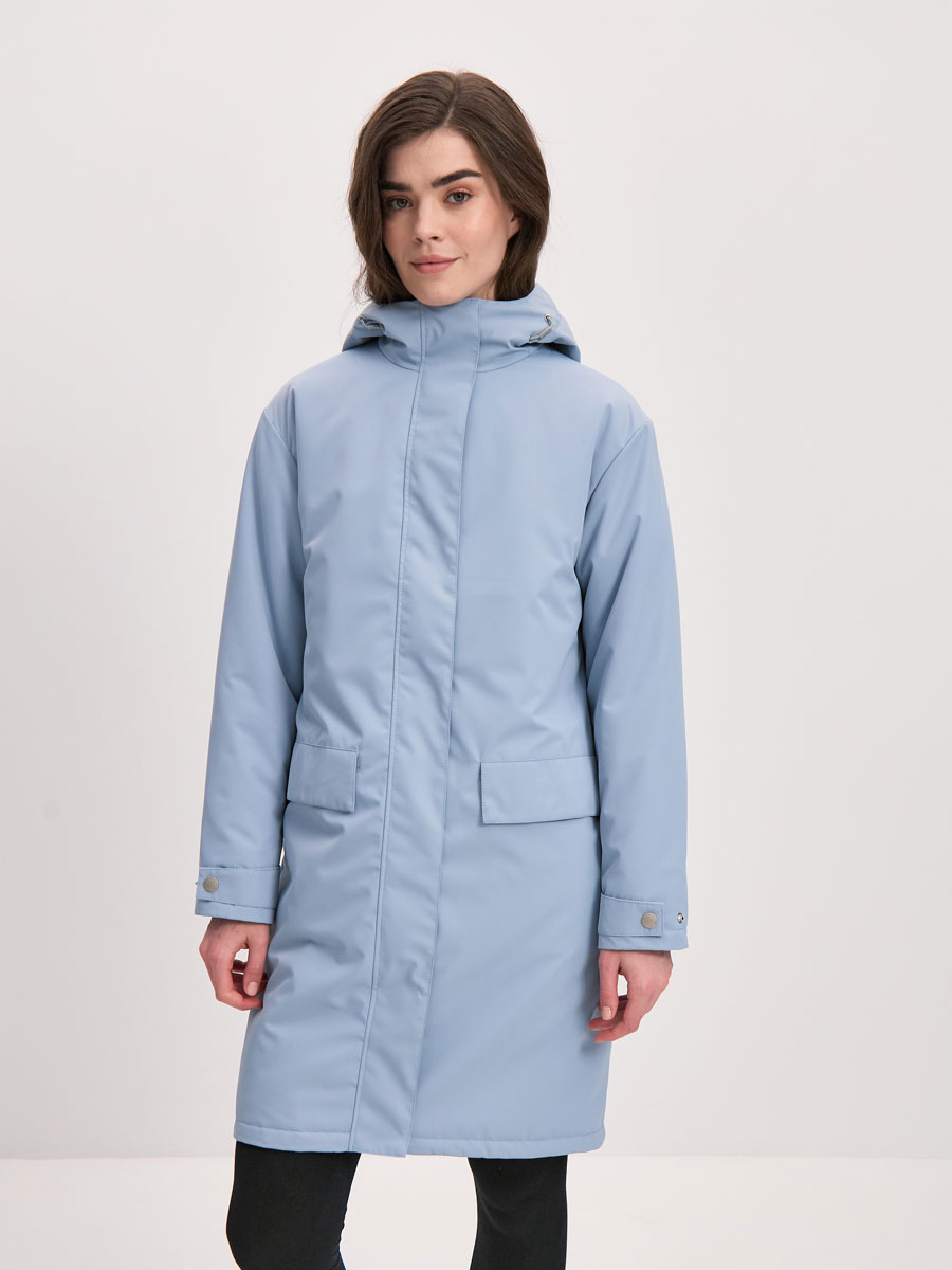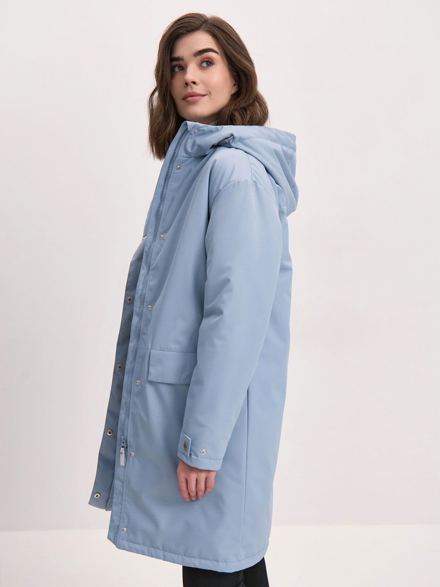 Демисезонная удлиненная куртка для женщин из мембранной ткани с капюшоном. Застежка на молнию, закрытая планкой на кнопках. Подкладка с накладным карманом. Втачной капюшон. 2 прорезных кармана с клапаном на магнитных кнопках. Рассчитана на температуру от -5 до +10. Утеплитель: 100% полиэстер Подкладка: 100% полиэстер