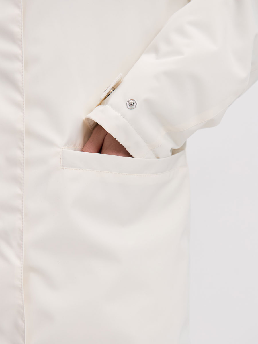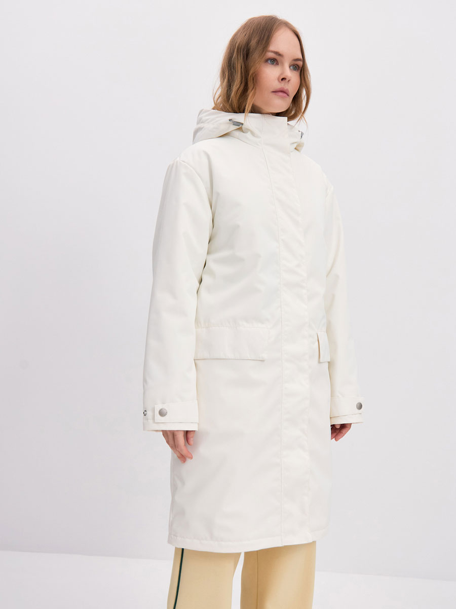 Демисезонная удлиненная куртка для женщин из мембранной ткани с капюшоном. Застежка на молнию, закрытая планкой на кнопках. Подкладка с накладным карманом. Втачной капюшон. 2 прорезных кармана с клапаном на магнитных кнопках. Рассчитана на температуру от -5 до +10.