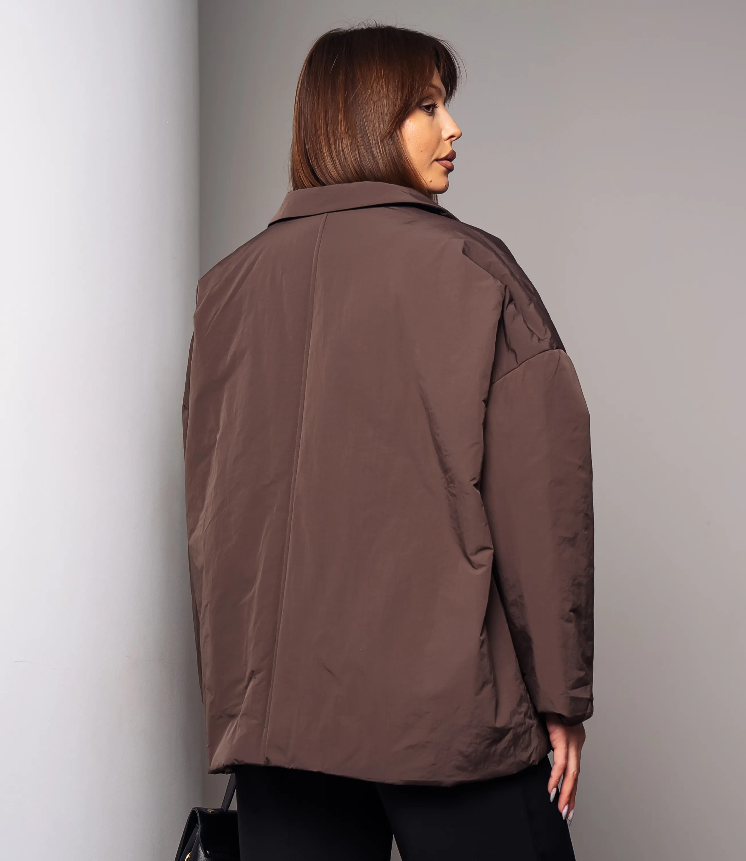 Куртка — это часть гардероба, которая подчёркивает привлекательность и индивидуальность каждой покупательницы. Куртка в свободном, слегка оверсайз силуэте с выраженной мягкой плечевой линией и умеренной длиной до верхней части бёдер; материал гладкий, плотной структуры с лёгким блеском и водоотталкивающей пропиткой, внутри — тонкая утепляющая прослойка, придающая объём без жесткости. Лацканный воротник со строгой выточкой, переходящей в прямую переднюю планку на две скрытые пуговицы; застёжка ровная, швы обработаны аккуратно, без декоративных строчек. Рукава цельнокроеные, с свободной посадкой по предплечью и лёгким сбором у манжет, которые не фиксируются резинкой или кнопкой; плечи опущенные, создающие расслабленный силуэт. Два накладных кармана с прямыми клапанами по боковым швам, расположенные на удобной высоте для рук, с усиленными краями; внутренняя часть без видимых дополнительных отделений. Низ прямой с чуть округлённой передней кромкой, подкладка гладкая, без декоративных вставок. Для пошива использованы 100% полиэстера, сочетание натурального комфорта и синтетической надёжности. Рекомендуем позиционировать куртку как ключевой элемент капсулы smart casual, сочетая её с брюками высокой посадки, юбками‑карандаш или худи. Визуально подчёркивайте контраст текстур рукавов в витрине и онлайн‑карточке, предлагайте несколько базовых оттенков и одну‑две акцентные версии для увеличения оборачиваемости.