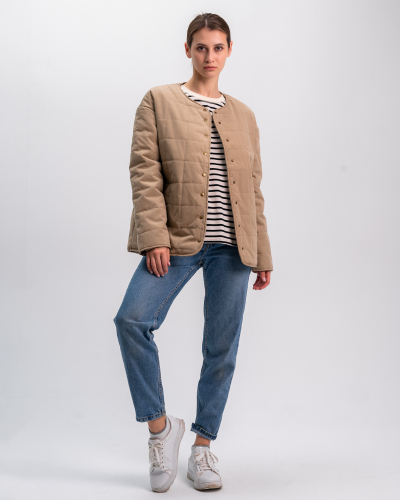 Легкая куртка-пиджак с открытой горловиной.Модель застегивается на кнопки и дополнена двумя внутренними карманами.