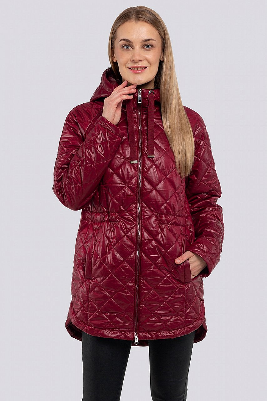 Куртка женская из стеганой ткани прямого силуэта, слегка ниже линии бедер. Куртка не сковывает движений благодаря слегка свободному крою и позволяет чувствовать себя максимально комфортно в прохладную погоду. Сзади куртка немного удлинена. По бокам декоративные округлые разрезы, по талии кулиса на регулируемой резинке. Небольшой капюшон согреет вас в ветреную погоду. По переду карманы с листочкой расположены в рельефах. Застежка на молнию. Утеплитель термофин, плотность 100. винный