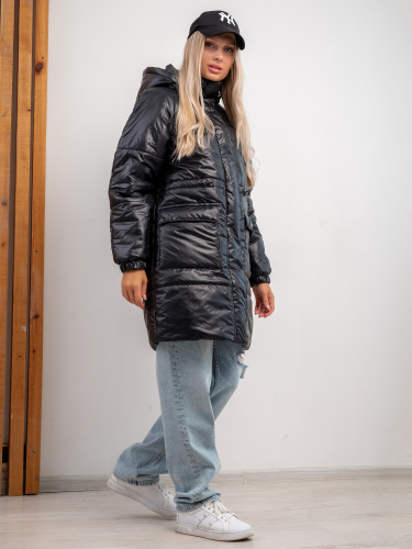 Зимняя удлиненная куртка со съемным капюшоном. Молния закрыта планкой на кнопках. Кулиска по талии позволяет регулировать посадку. Модель дополнена двумя накладными карманами.