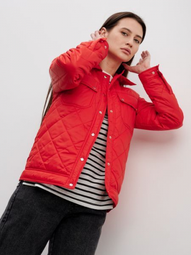 Легкий стеганый бомбер. Модель застегивается на кнопки и дополнена двумя накладными карманами.Кнопки на манжетах позволяют регулировать диаметр рукавов.