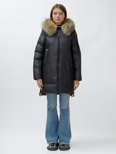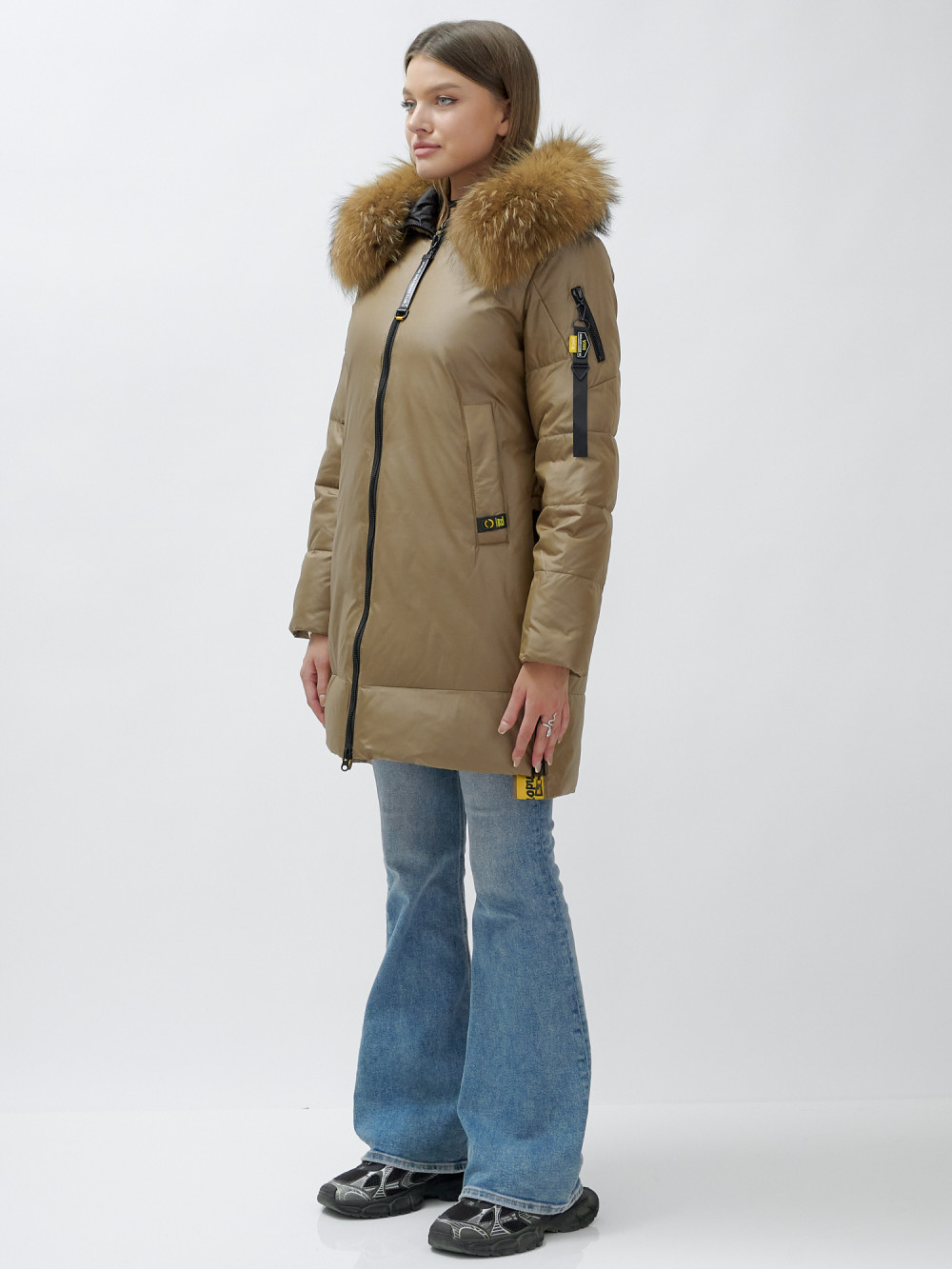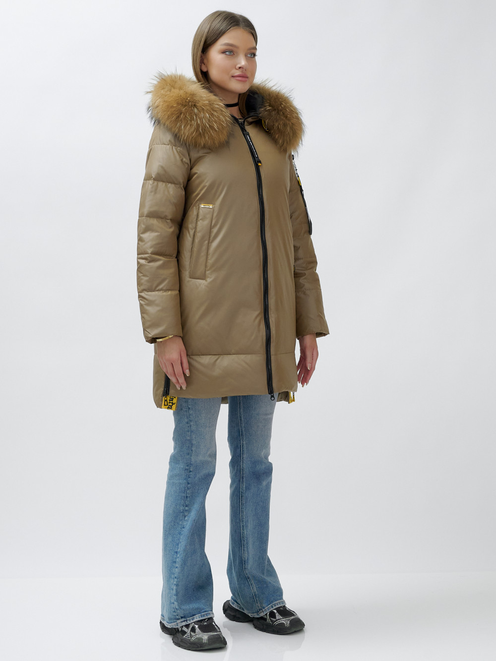 Куртка женская зимняя с мехом енот премиум класса коричневого цвета 871K