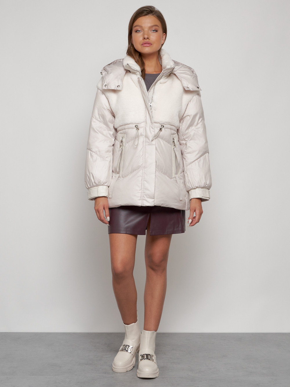 Куртка зимняя женская модная из овчины бежевого цвета 13350B
