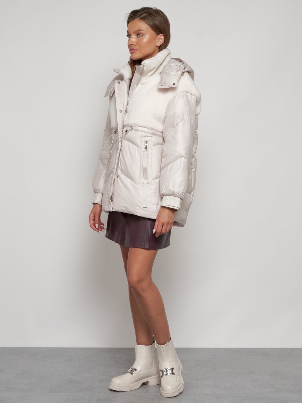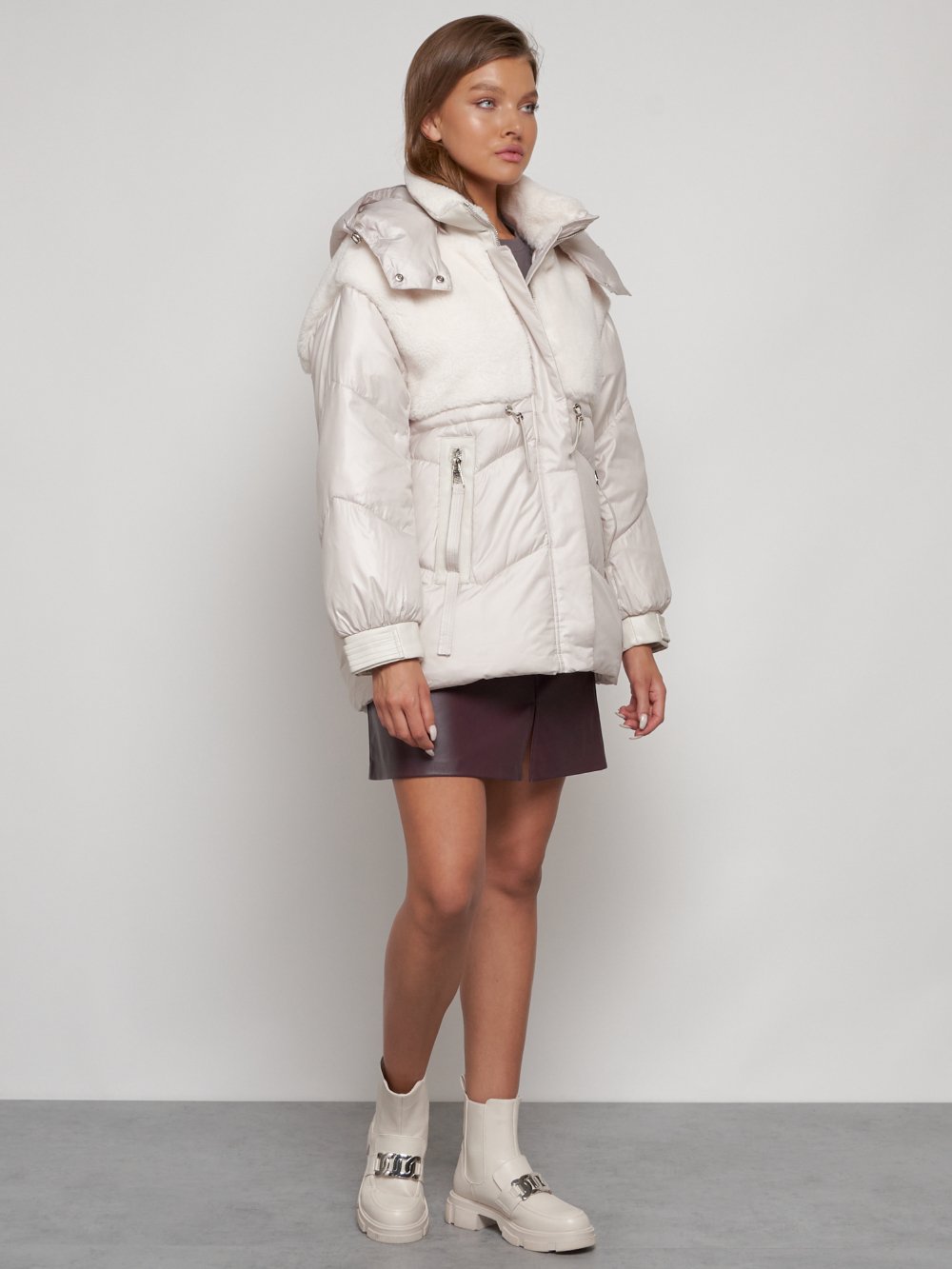 Куртка зимняя женская модная из овчины бежевого цвета 13350B