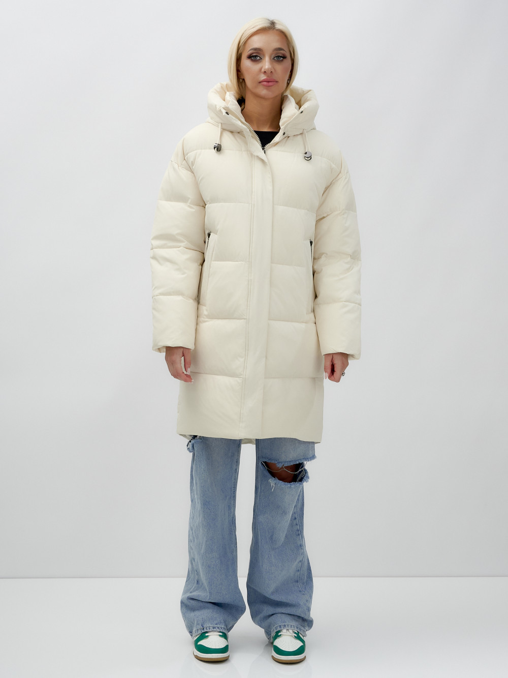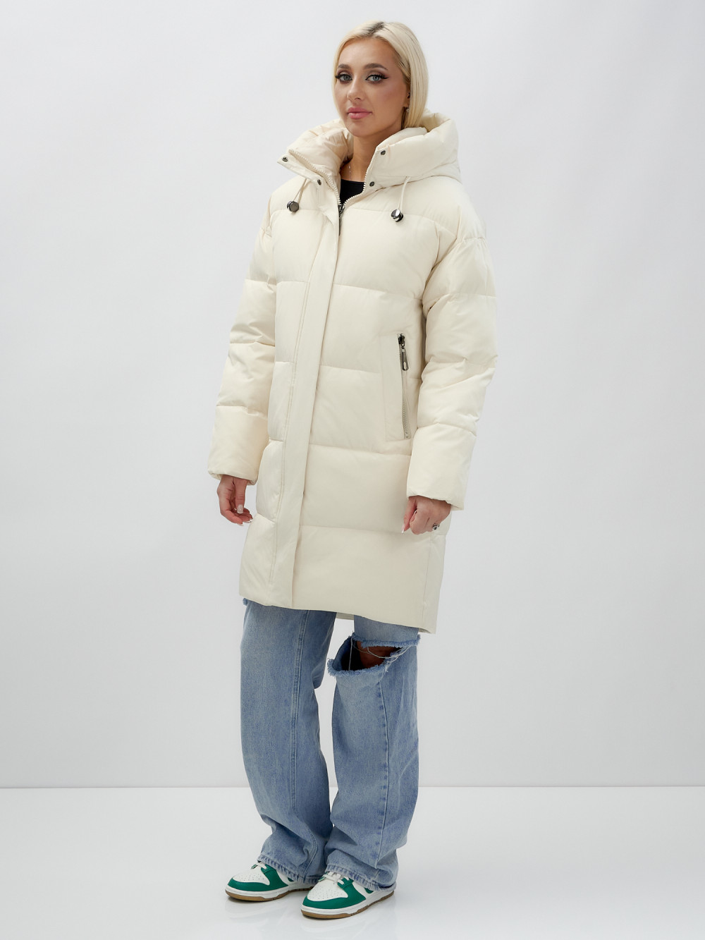 Куртка зимняя женская с капюшоном удлиненная стеганная бежевого цвета 9638B
