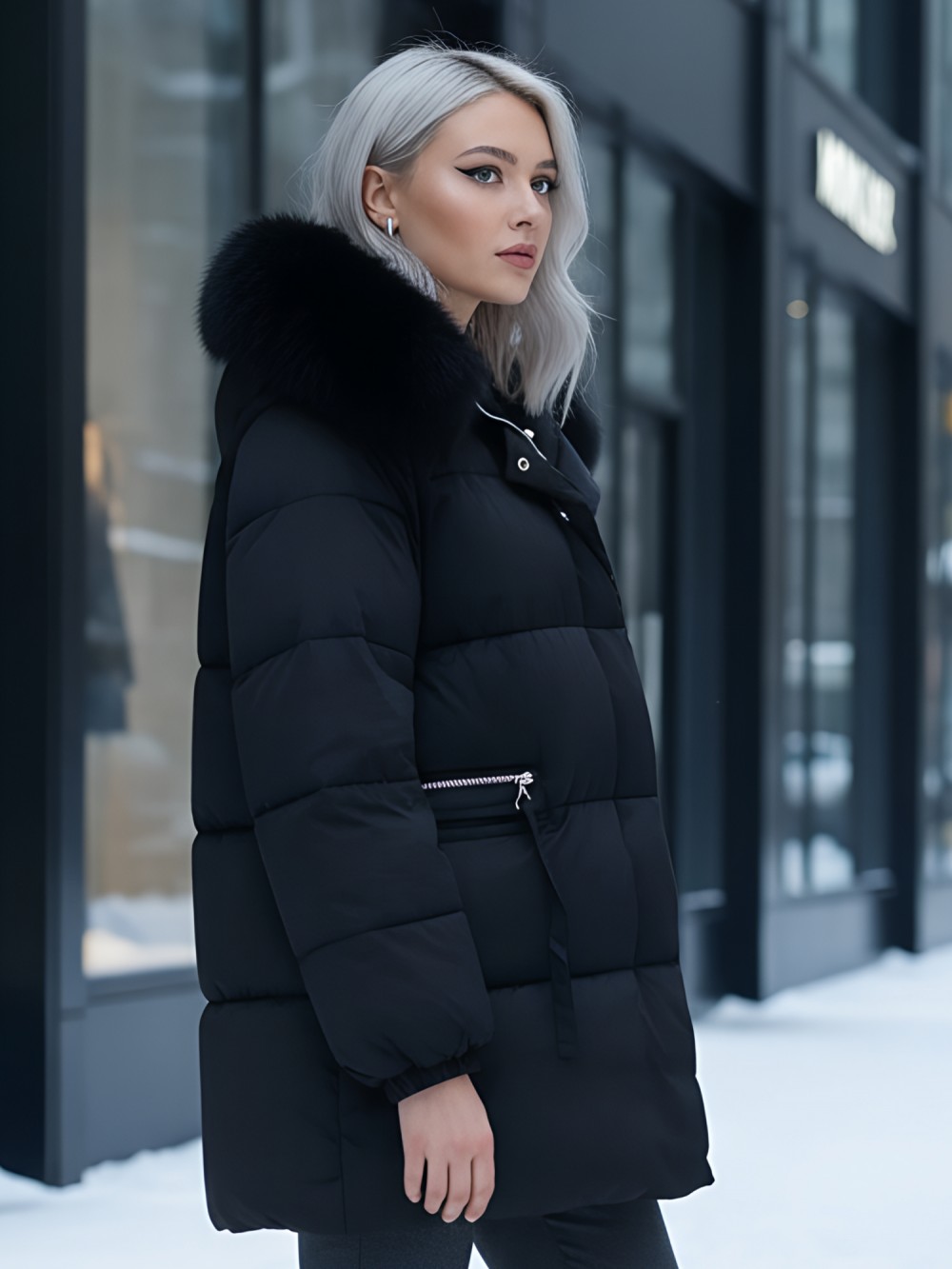 Четыре трендовых оттенка 2025 года – глубокий черный, благородный коричневый, элегантный бежевый и загадочный темно-зеленый – идеально гармонируют с роскошным мехом песца. Удлиненный силуэт до колена в сочетании с прямым кроем создает безупречные пропорции, делая фигуру более стройной.