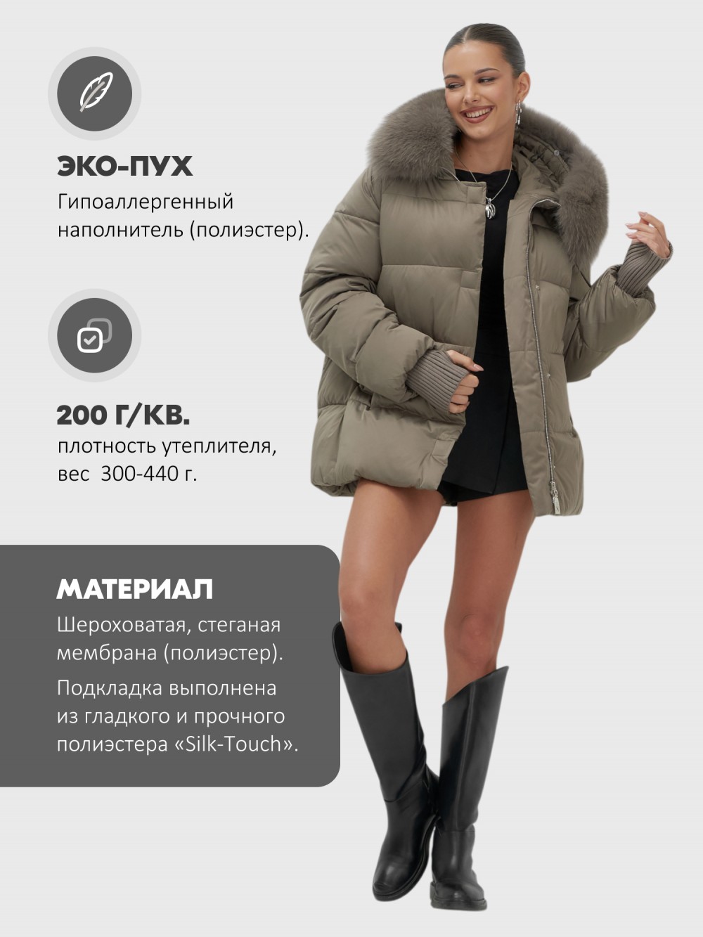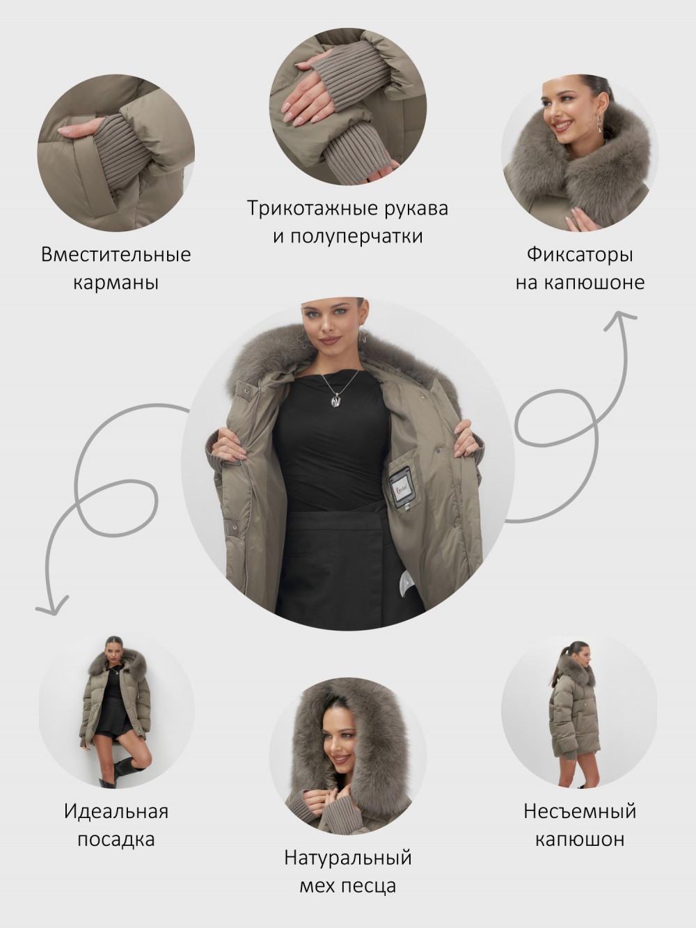 Особенности модели: быстросохнущая, ветрозащита, водоотталкивающий материал, гипоаллергенный материал, дышащий материал, съемная опушка