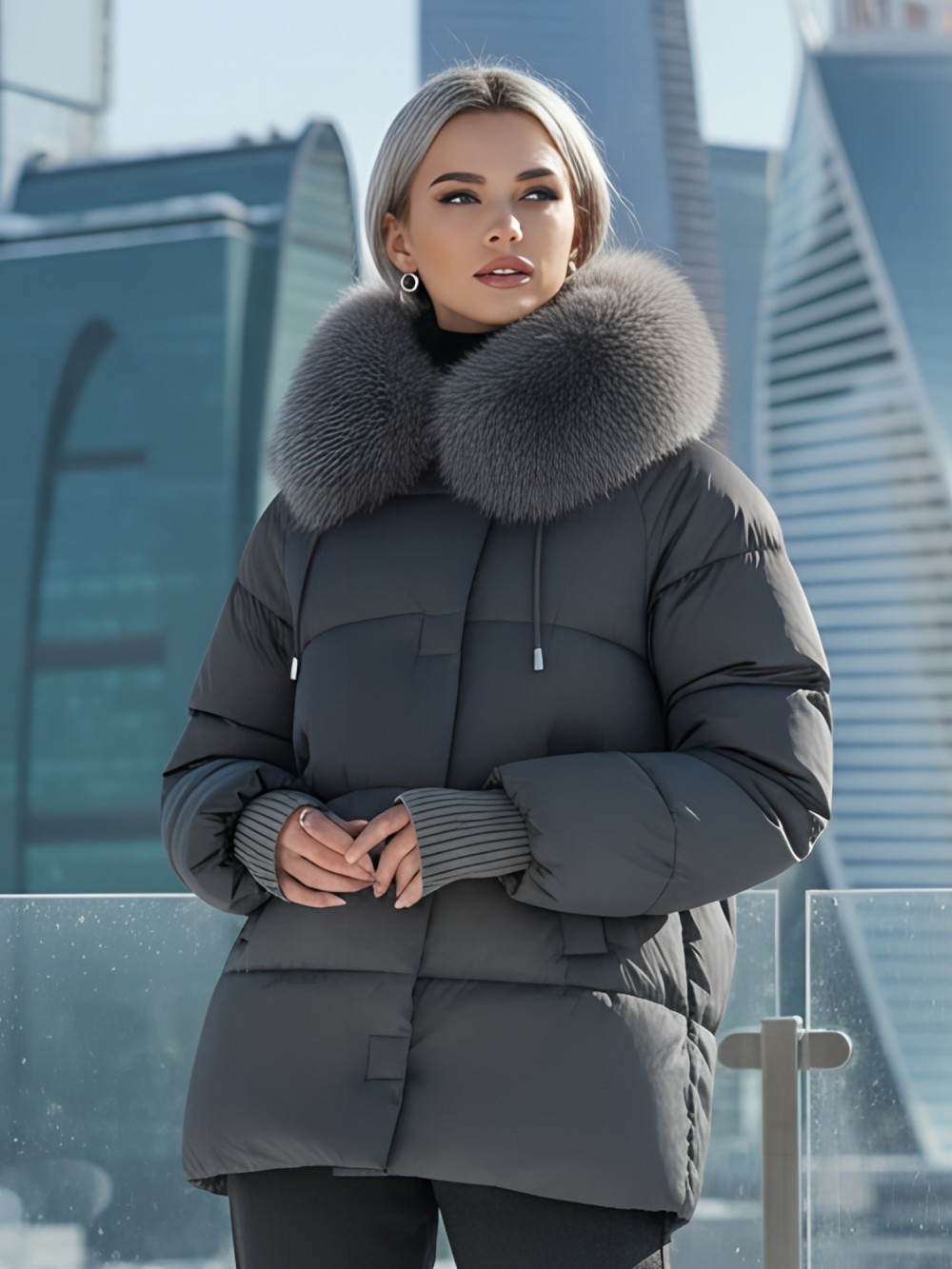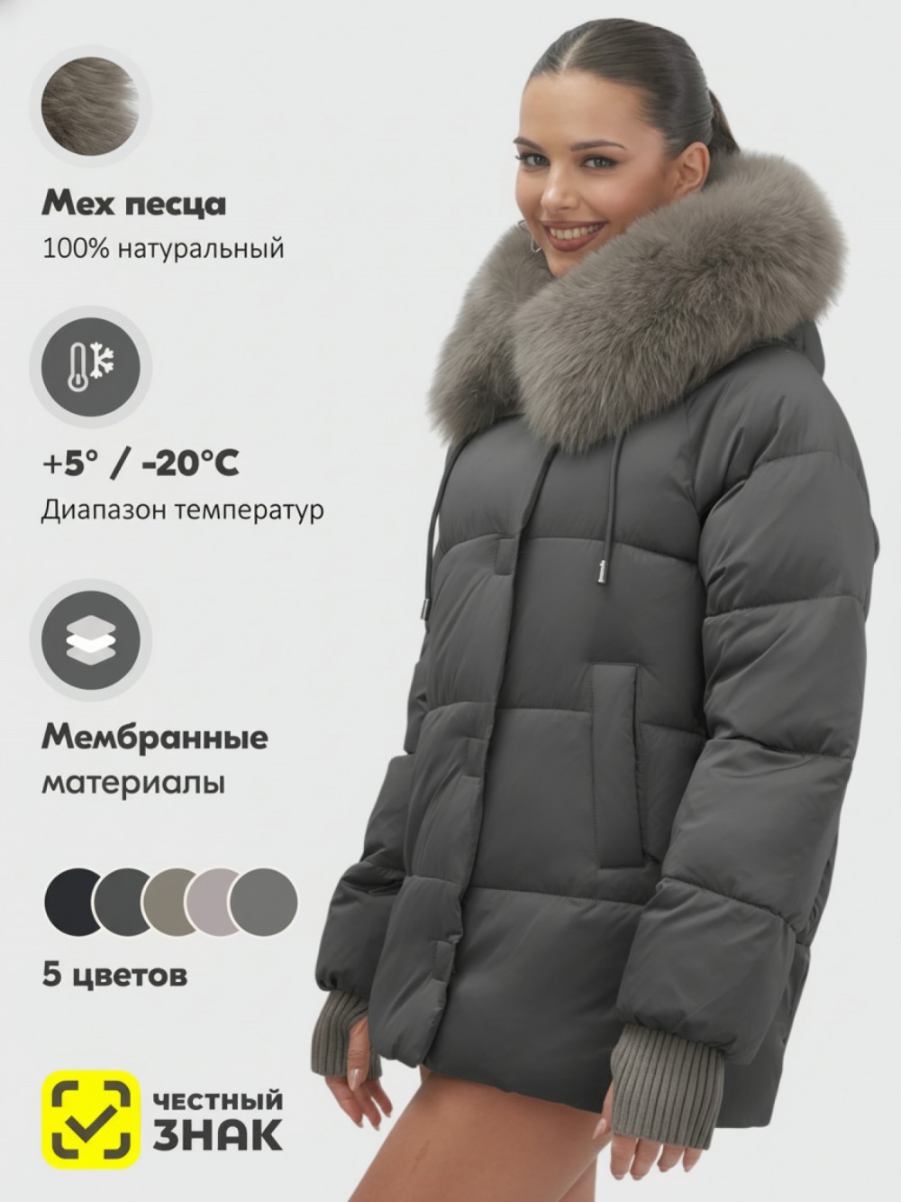 Четыре актуальных оттенка коллекции осень-зима 2025 – классический черный, роскошный коричневый, изысканный светло-коричневый и трендовый горчичный – великолепно гармонируют с натуральным мехом песца. Длина до бедра и свободный крой создают идеальные пропорции для размеров 44-52.
