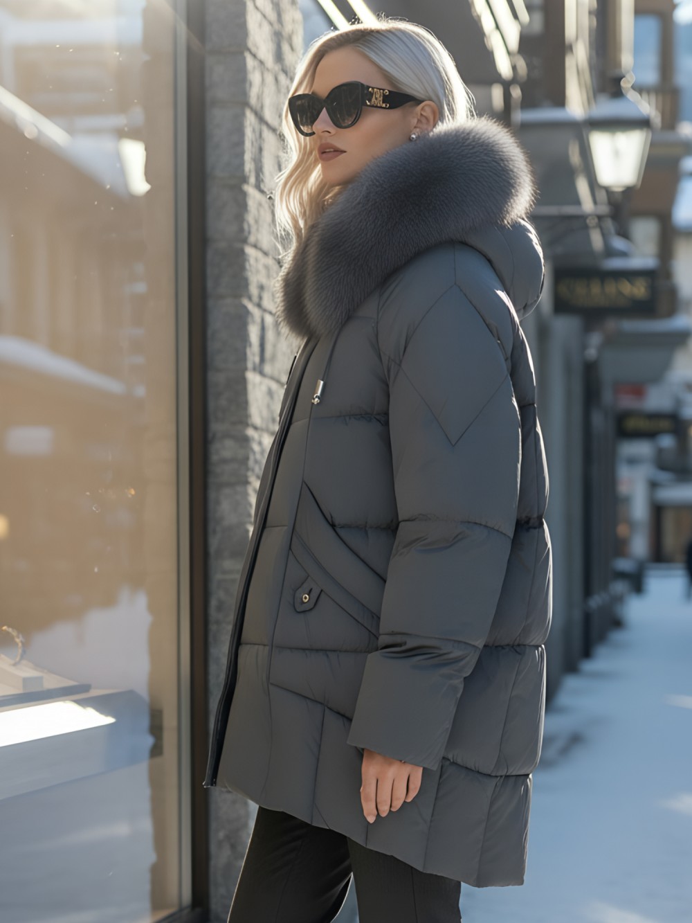 Высокотехнологичная мембрана 7000 мм и инновационный утеплитель плотностью 200 г/м² гарантируют комфорт до -20°C. Премиальные детали – двойная молния с защитным клапаном, вместительные карманы на магнитах и молнии, элегантные заклепки – подчеркивают статус владелицы.